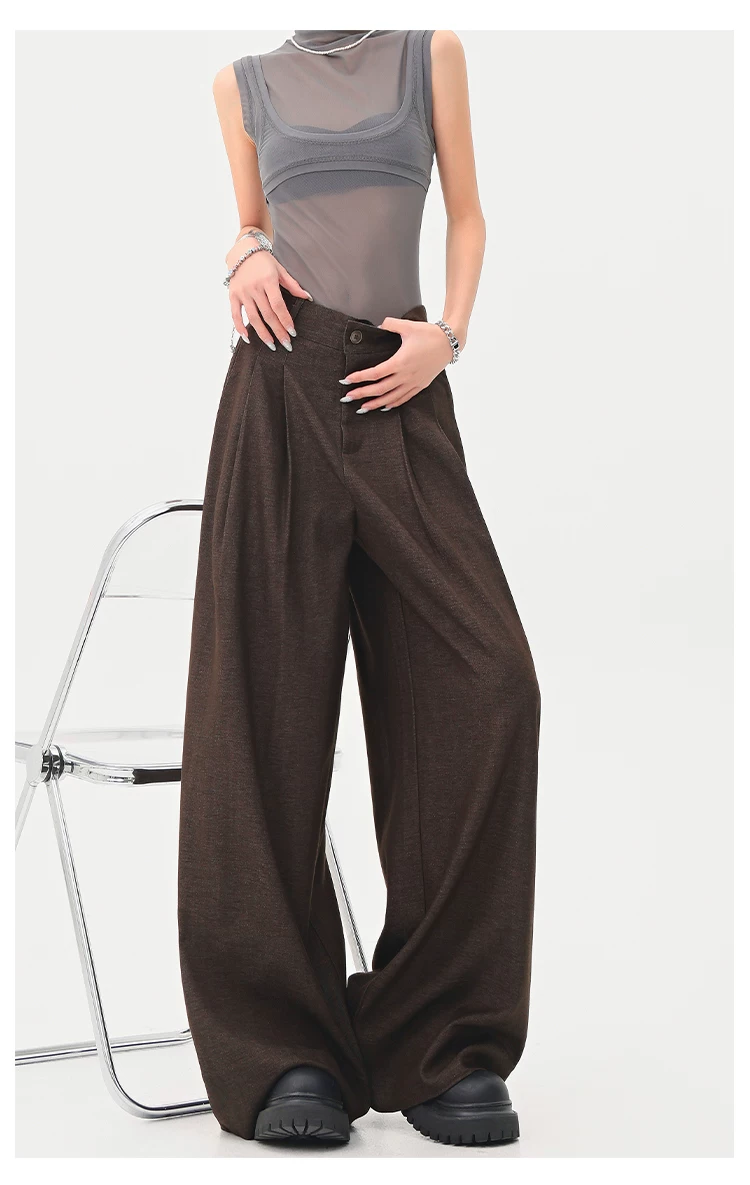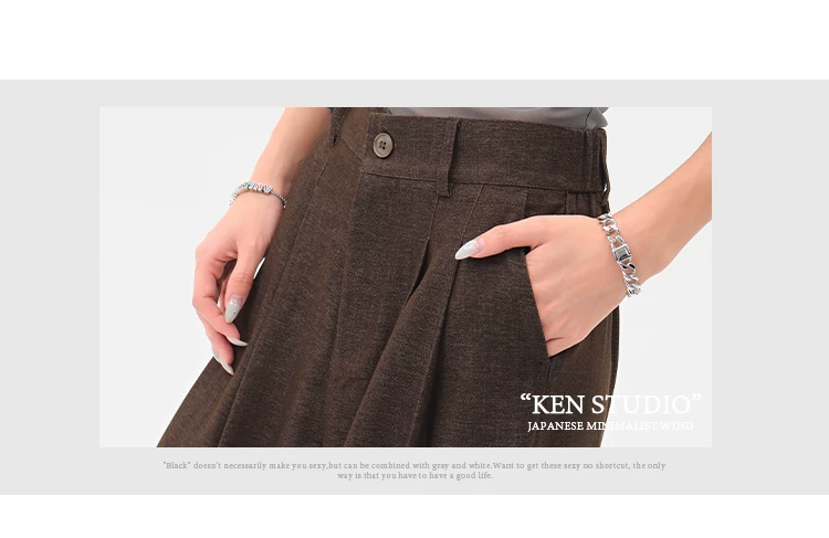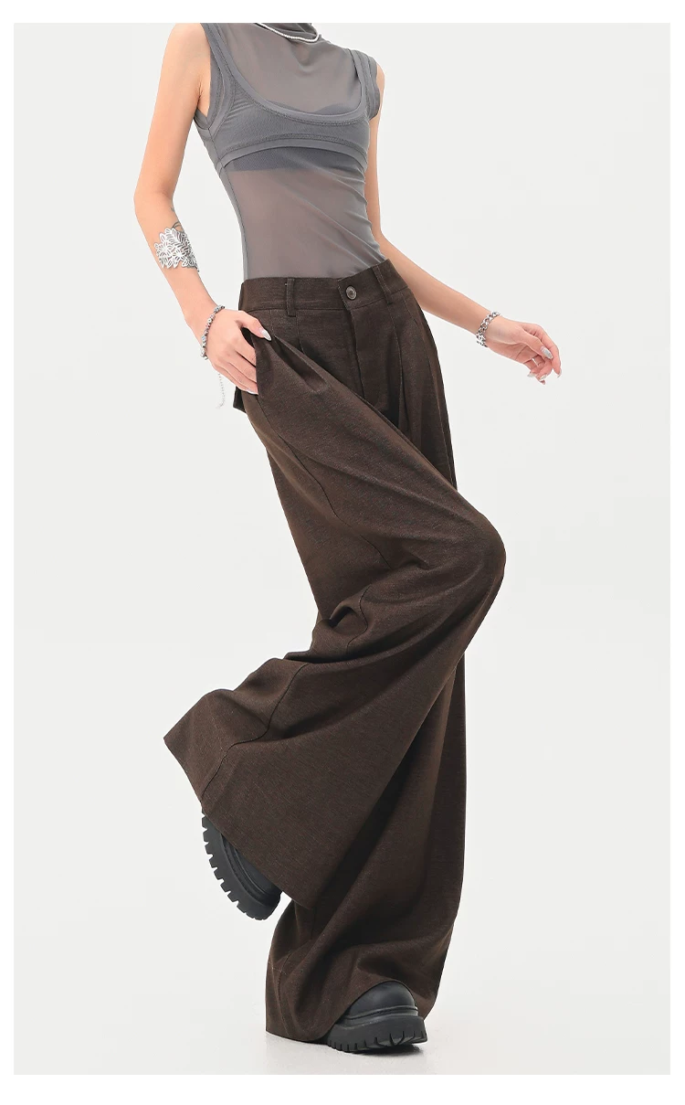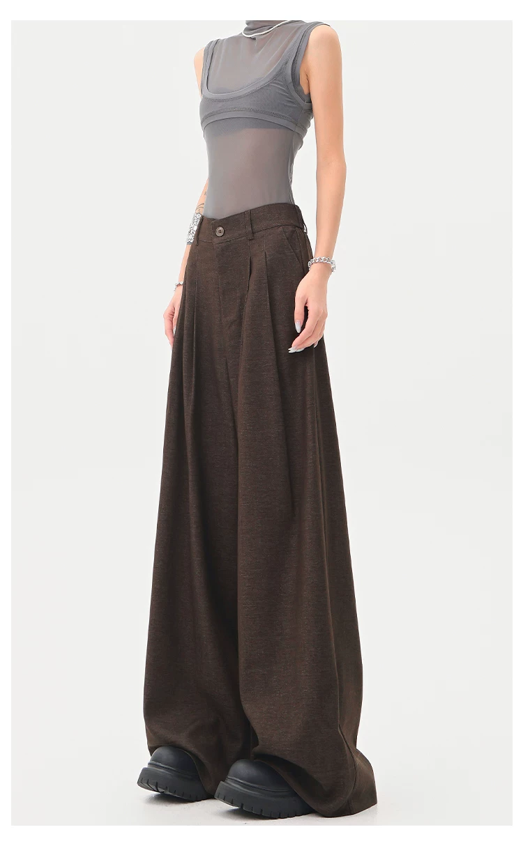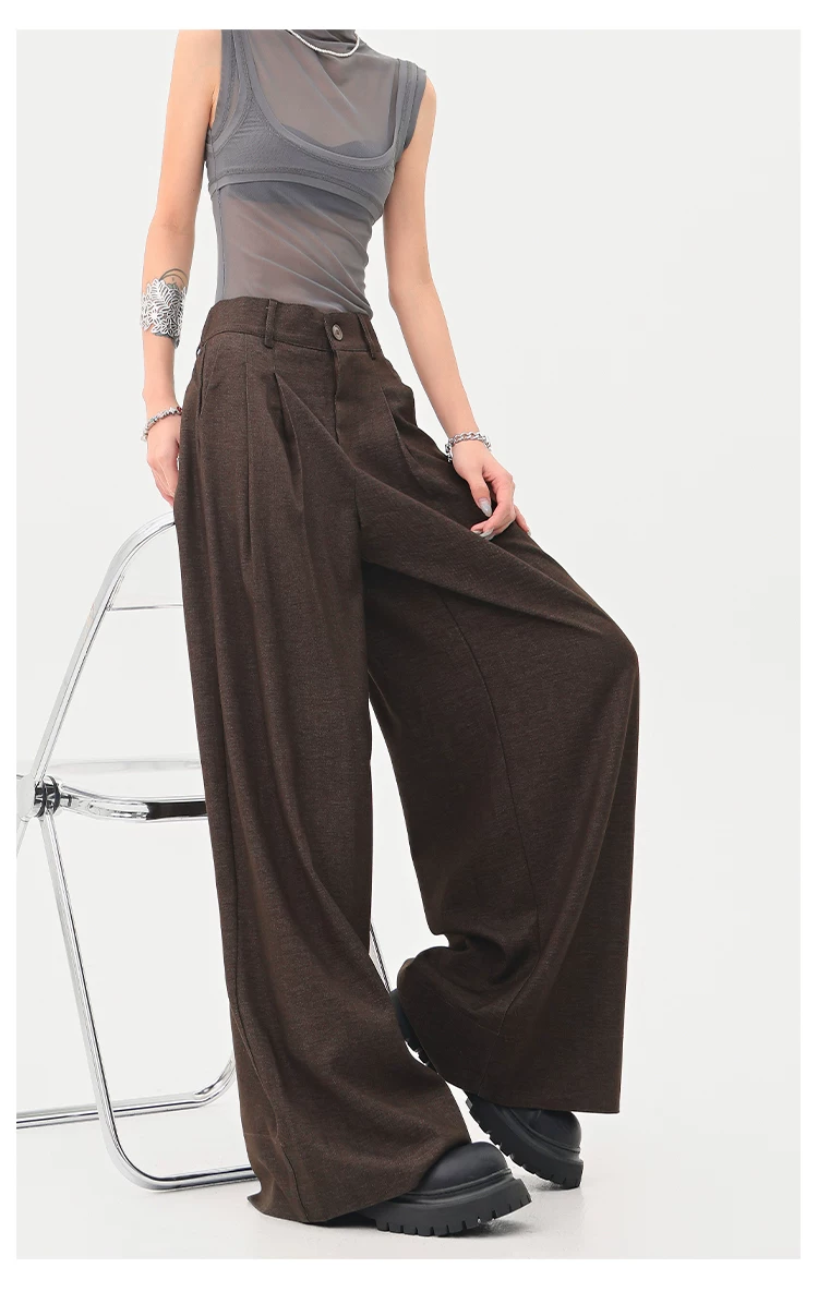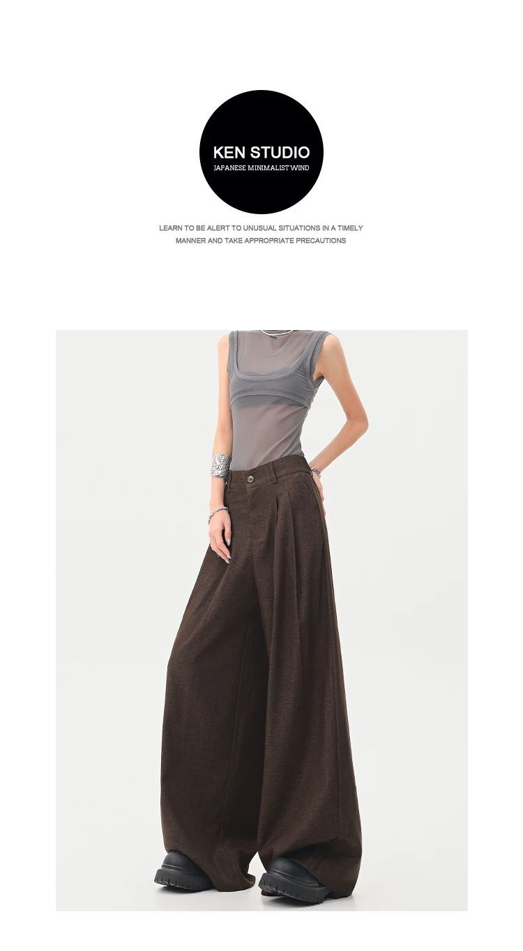 - KEN STUDIO Xuân Thu Quần tây màu nâu Melard mới dành cho nữ Quần tây ống rộng có eo bán co giãn dài đến sàn
