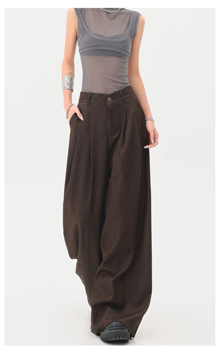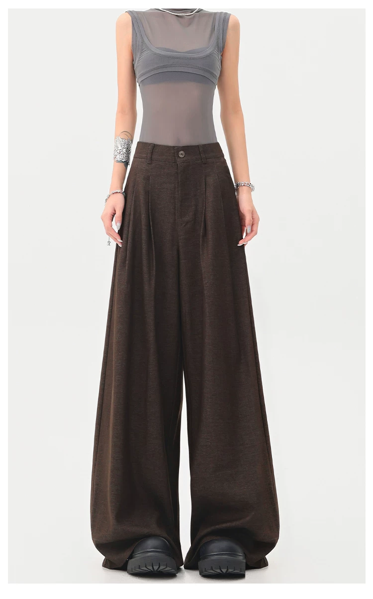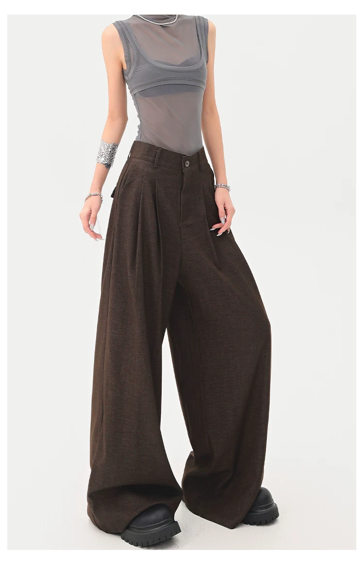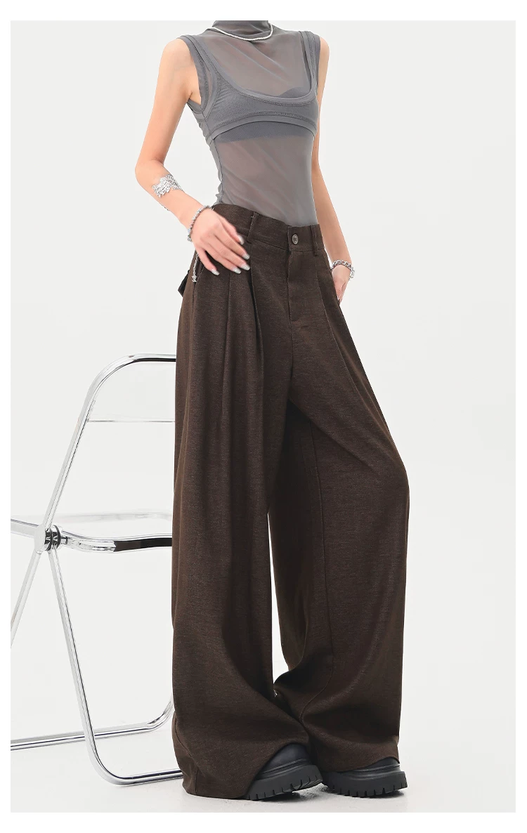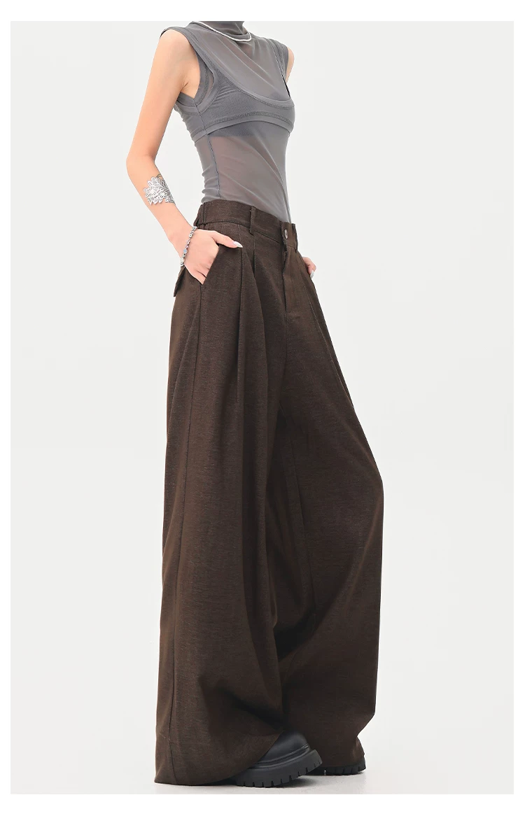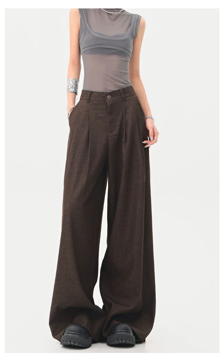 - KEN STUDIO Xuân Thu Quần tây màu nâu Melard mới dành cho nữ Quần tây ống rộng có eo bán co giãn dài đến sàn