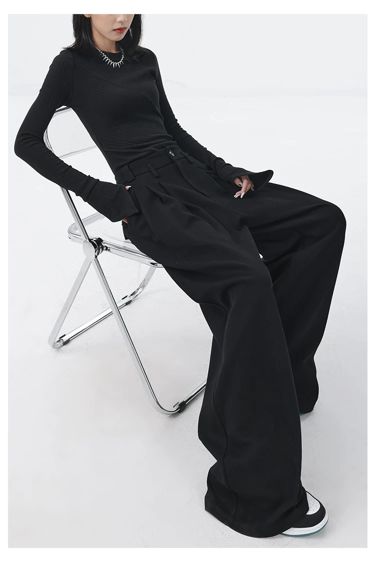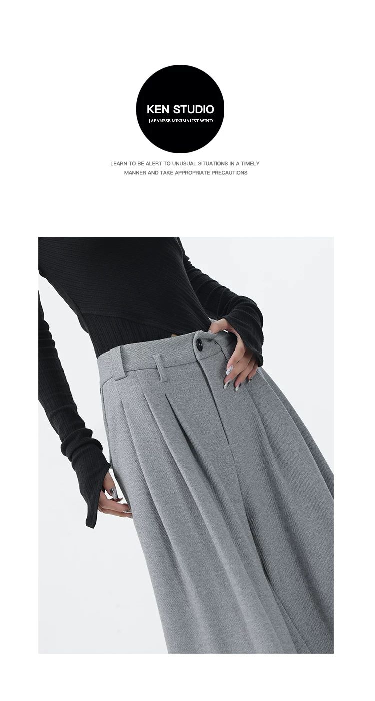 KEN STUDIO2025 Xuân Thu Mới Quần Âu Màu Đen Nữ Xếp Ly Thiết Kế Rộng Quần Ống Rộng Quần Dài