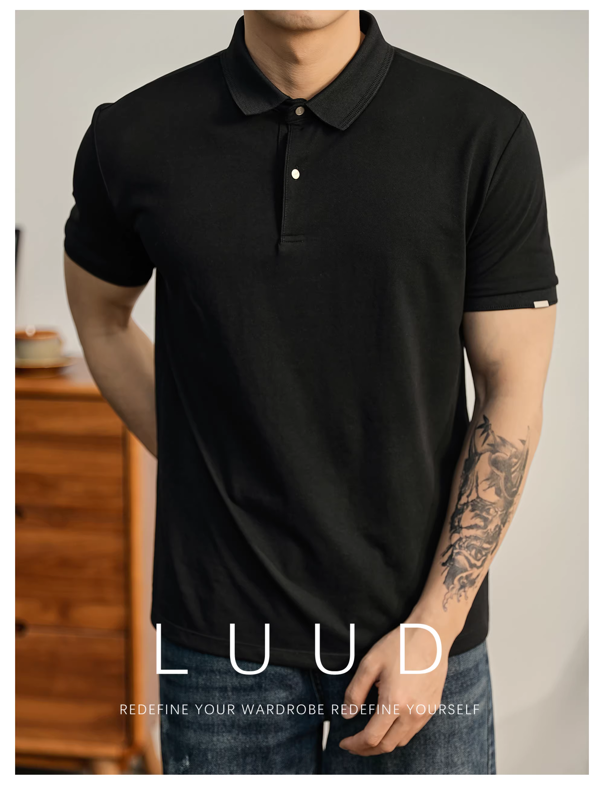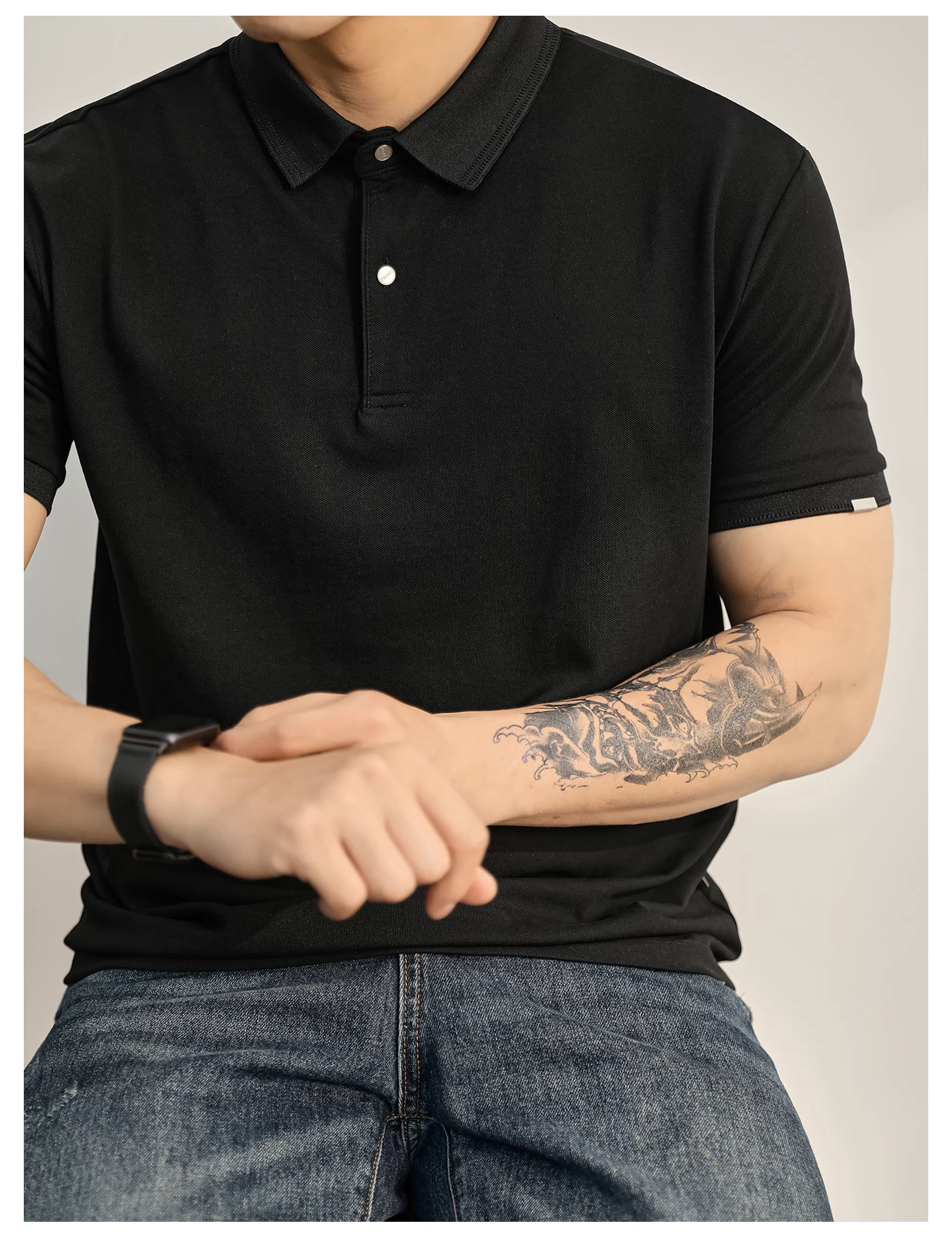Khuyến mãi đặc biệt: Áo Polo nam tay ngắn cổ trụ màu đen phong cách thường ngày đô thị, chất liệu cotton mềm mại, ôm dáng, thích hợp cho mùa hè.