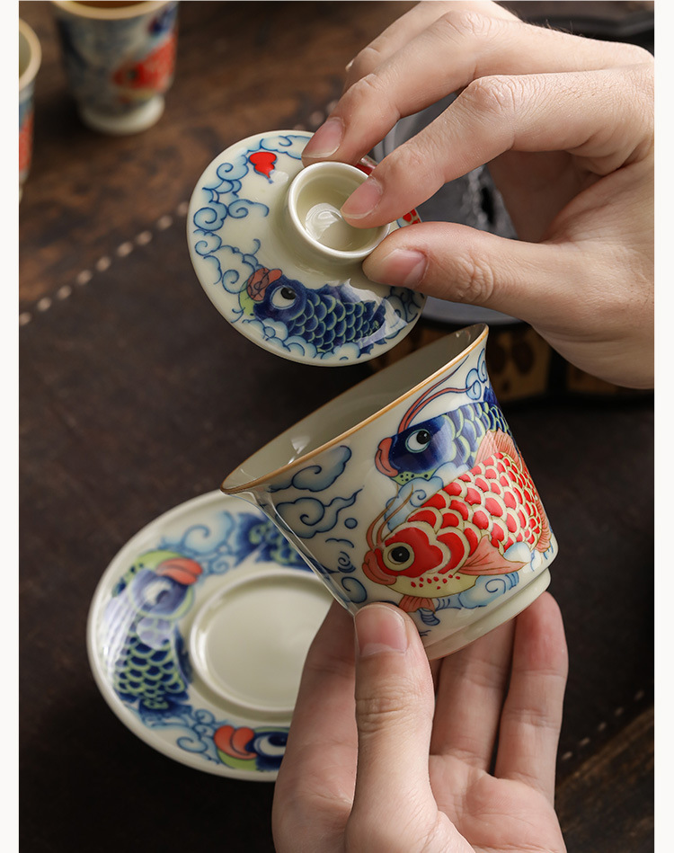 - Long cá móng ngựa ba cái nắp cốc trà bát pha trà tinh tế cao cấp gia dụng có nắp bộ trà kungfu đơn không nóng tay