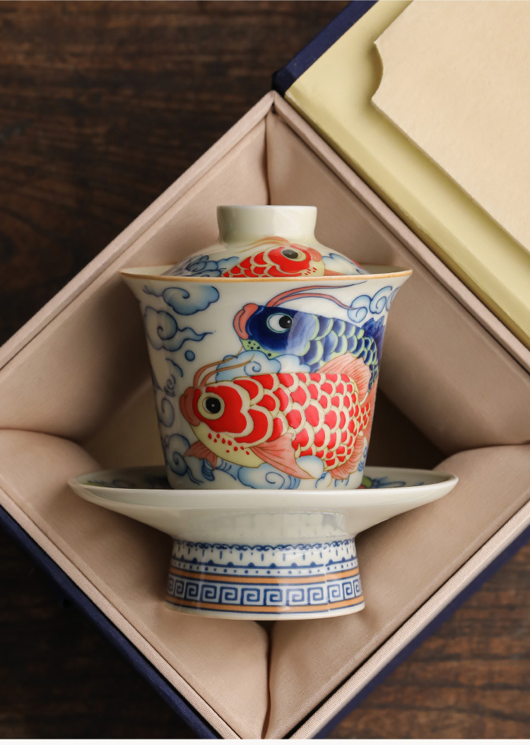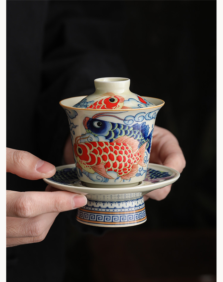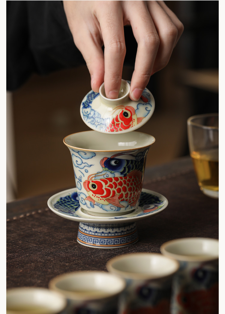 Long cá móng ngựa ba cái nắp cốc trà bát pha trà tinh tế cao cấp gia dụng có nắp bộ trà kungfu đơn không nóng tay