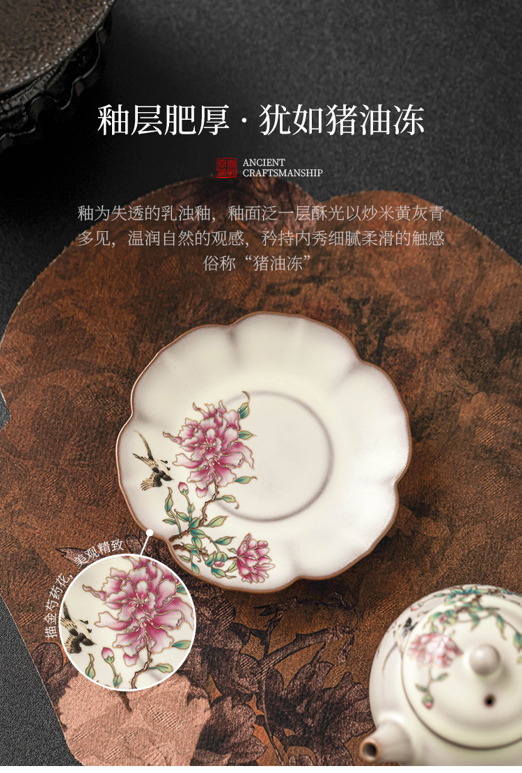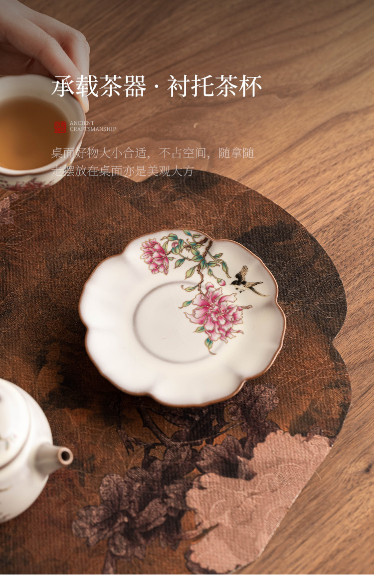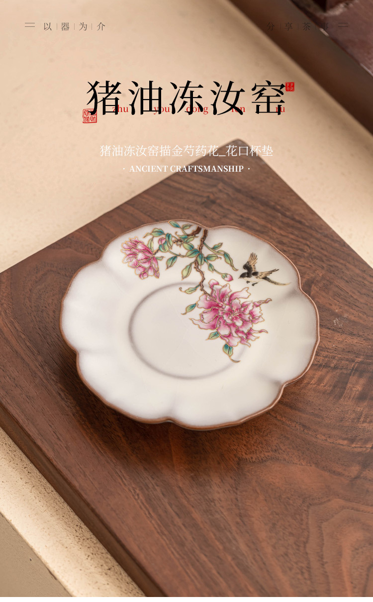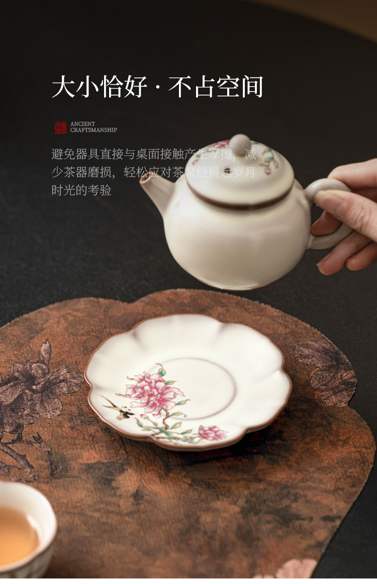 Lót cốc miệng hoa Ru Lò, thạch mỡ lợn, hoa mẫu đơn, tấm cách nhiệt chống trượt, cốc trà sứ Ru tinh tế, phụ kiện trà đạo, tấm trà