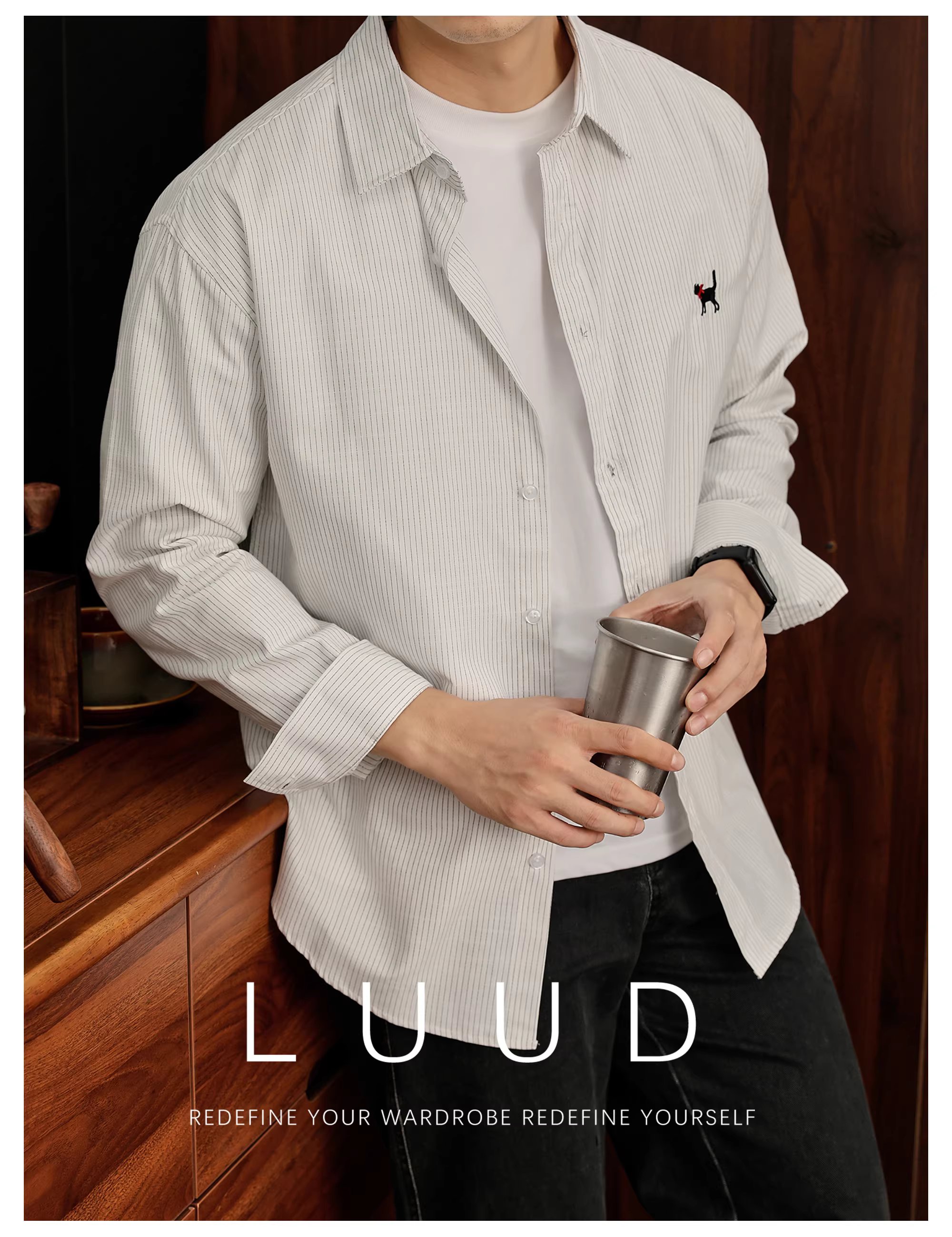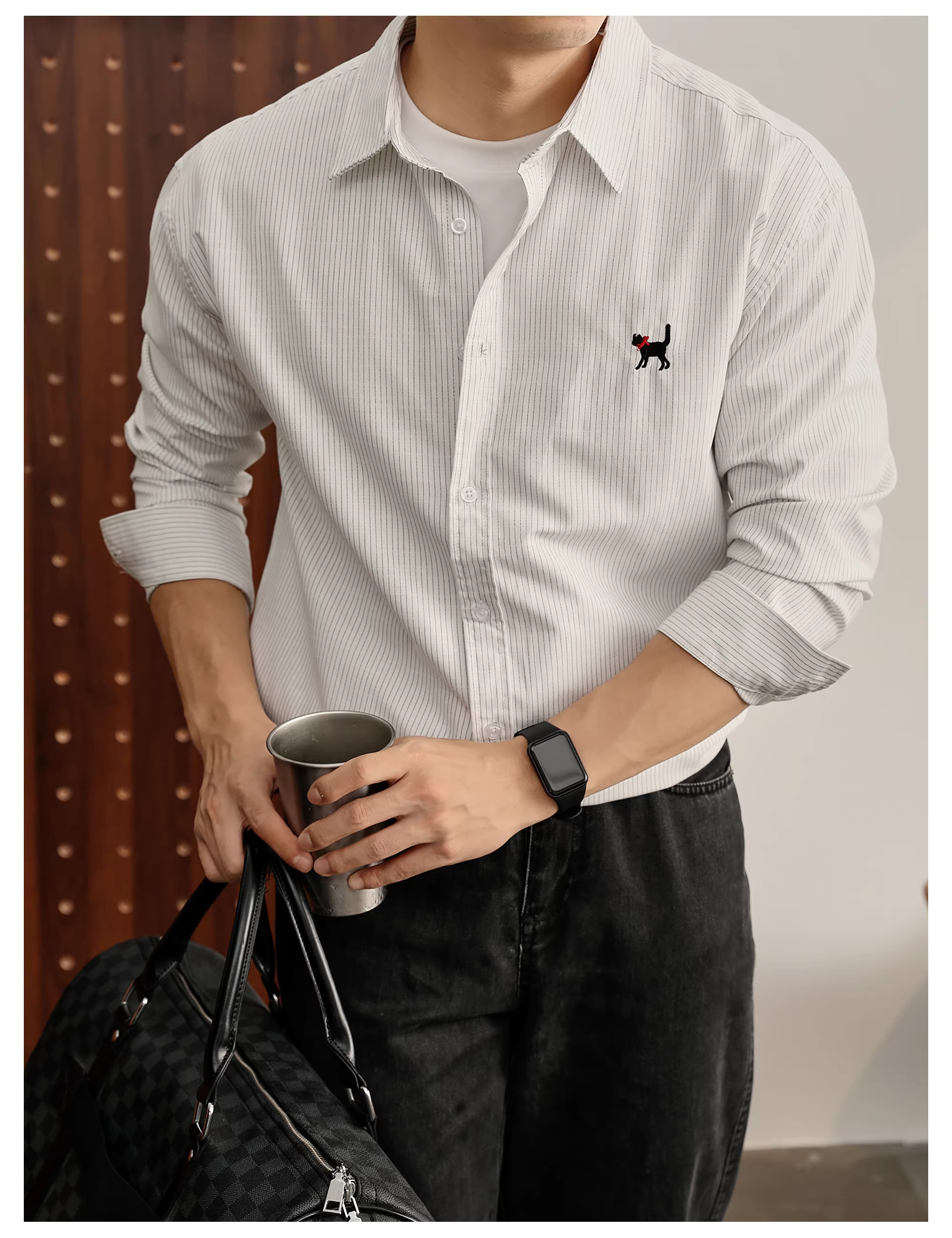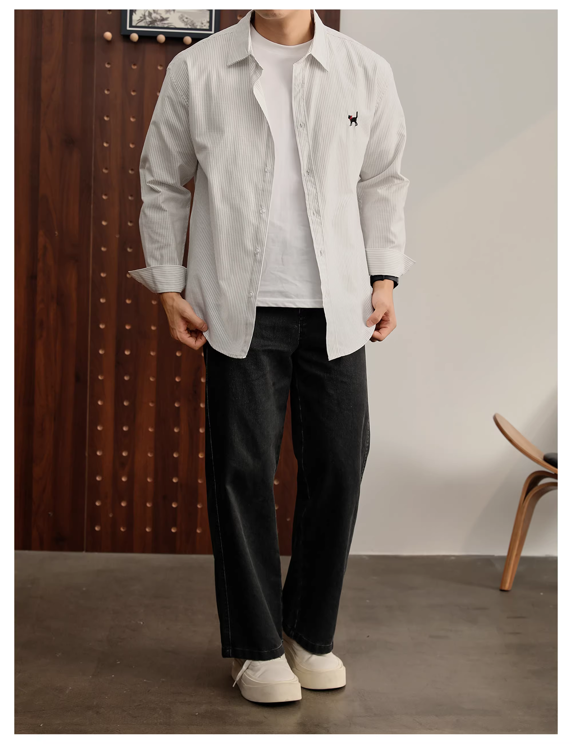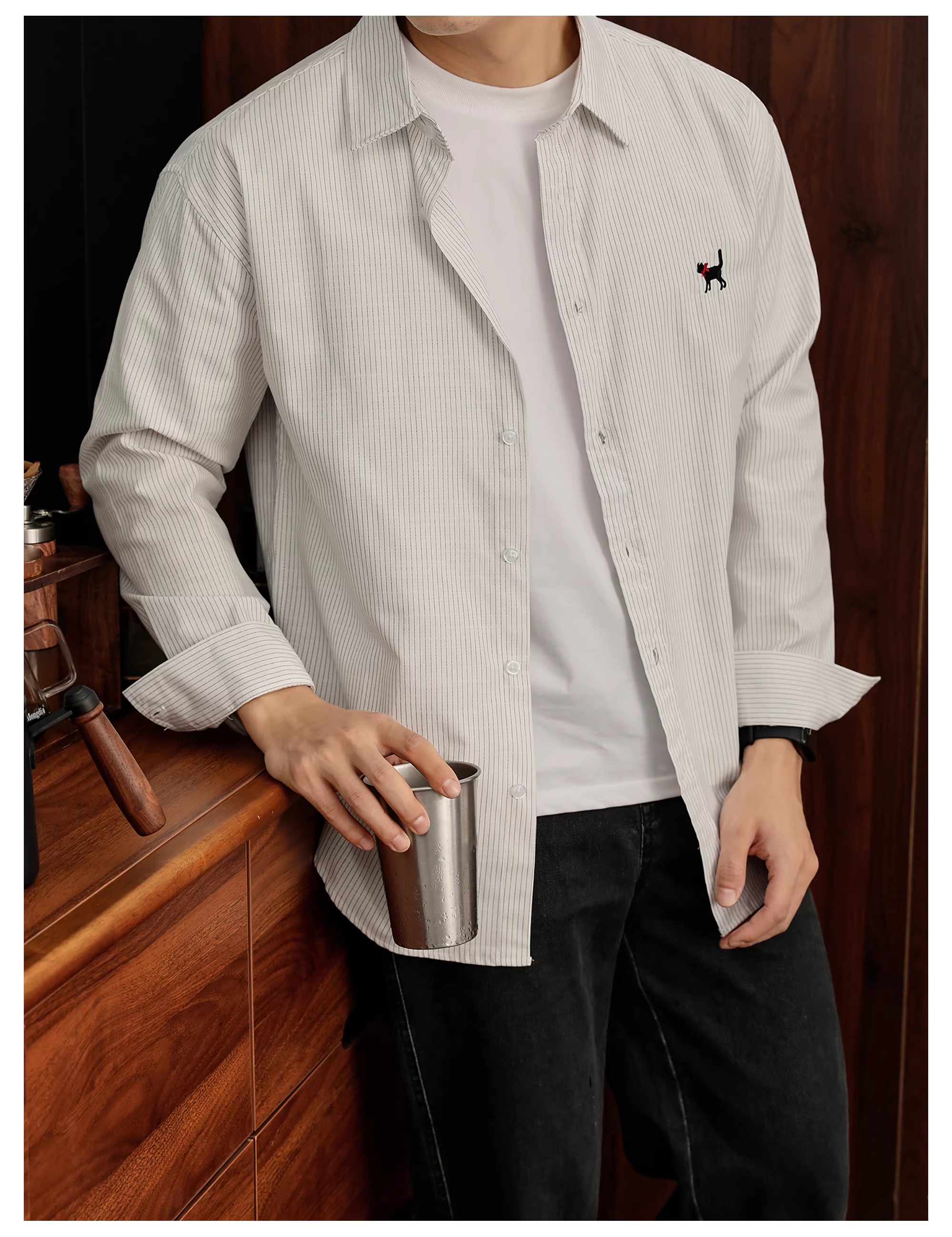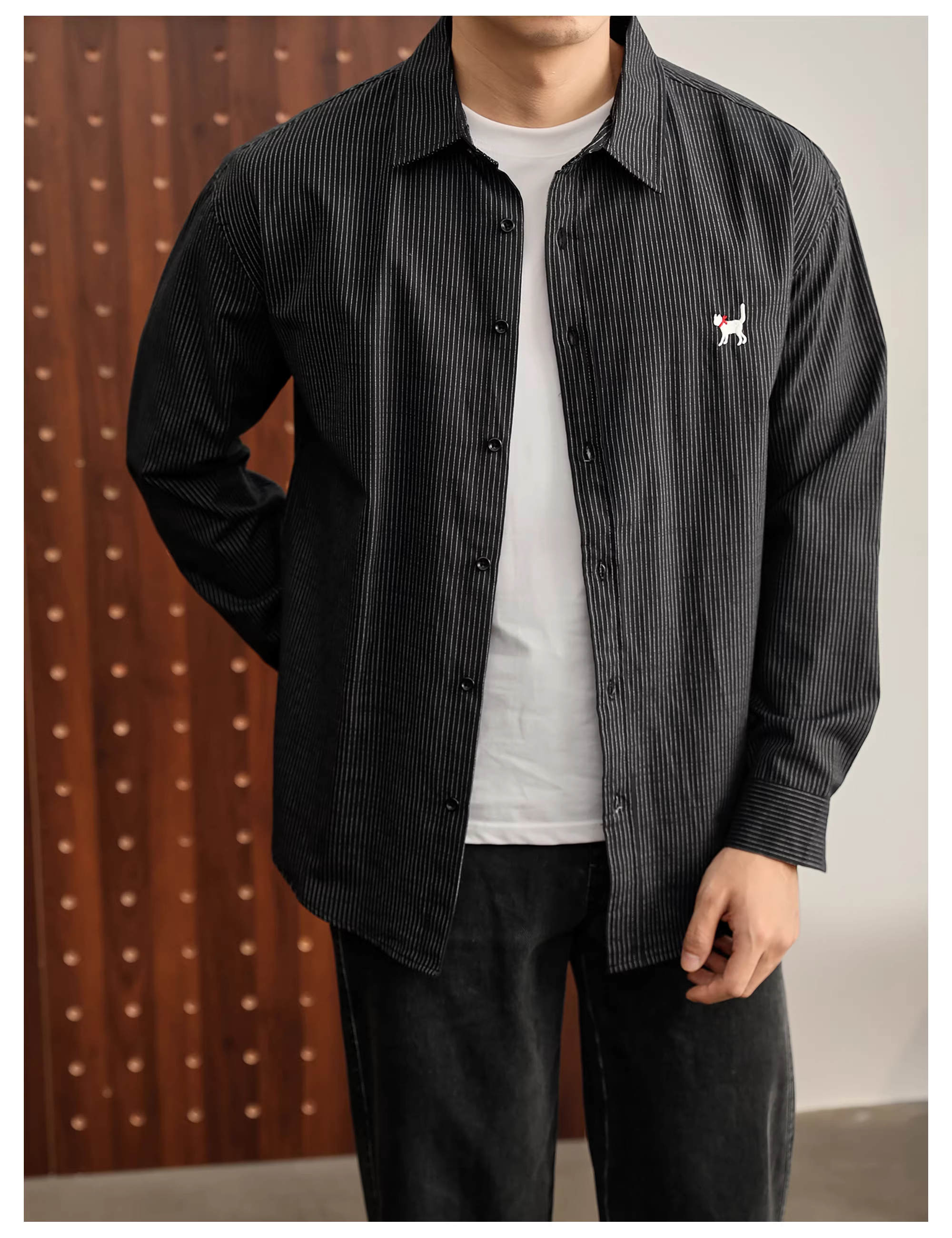 - LUUD 100% cotton nguyên chất retro dễ thương thêu hình mèo đen áo sơ mi nam mùa thu cổ điển sọc dọc dài tay