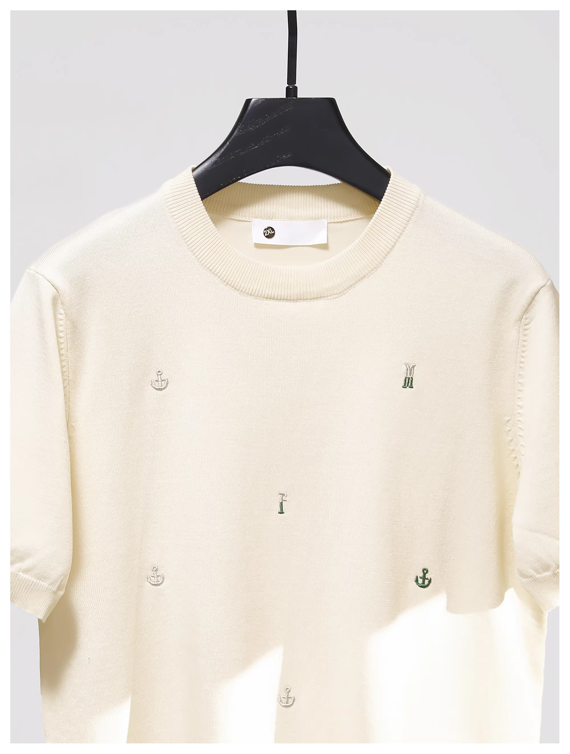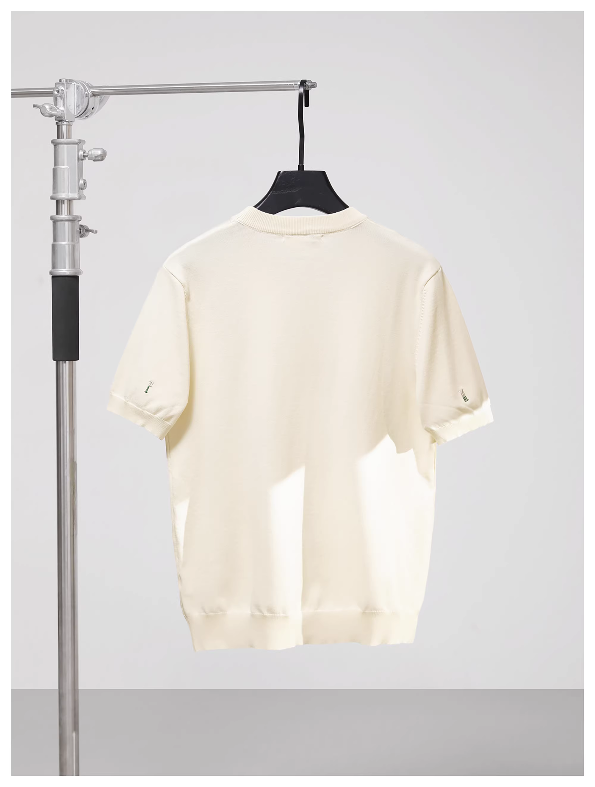 LUUD Áo thun nam dệt kim cổ tròn tay ngắn màu xanh lá cây sang trọng và thanh lịch mùa hè mát mẻ bằng lụa thêu chữ sáng tạo