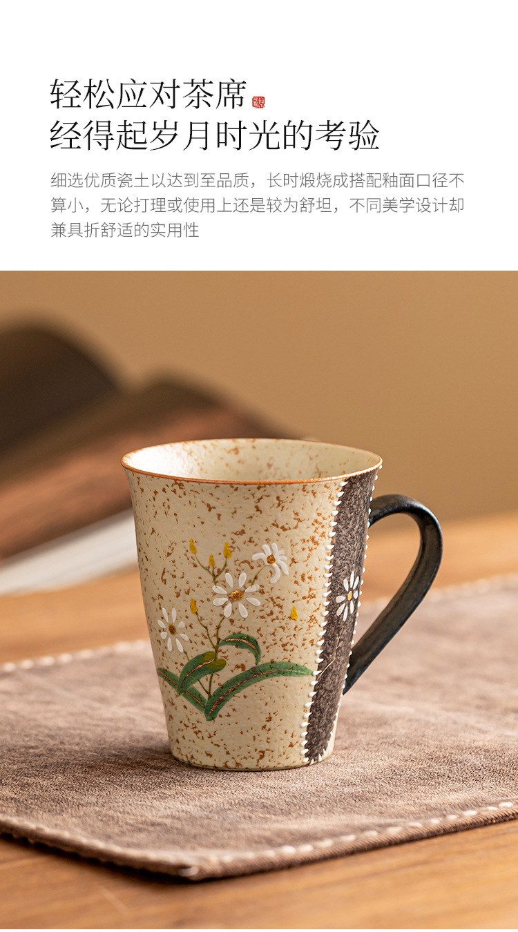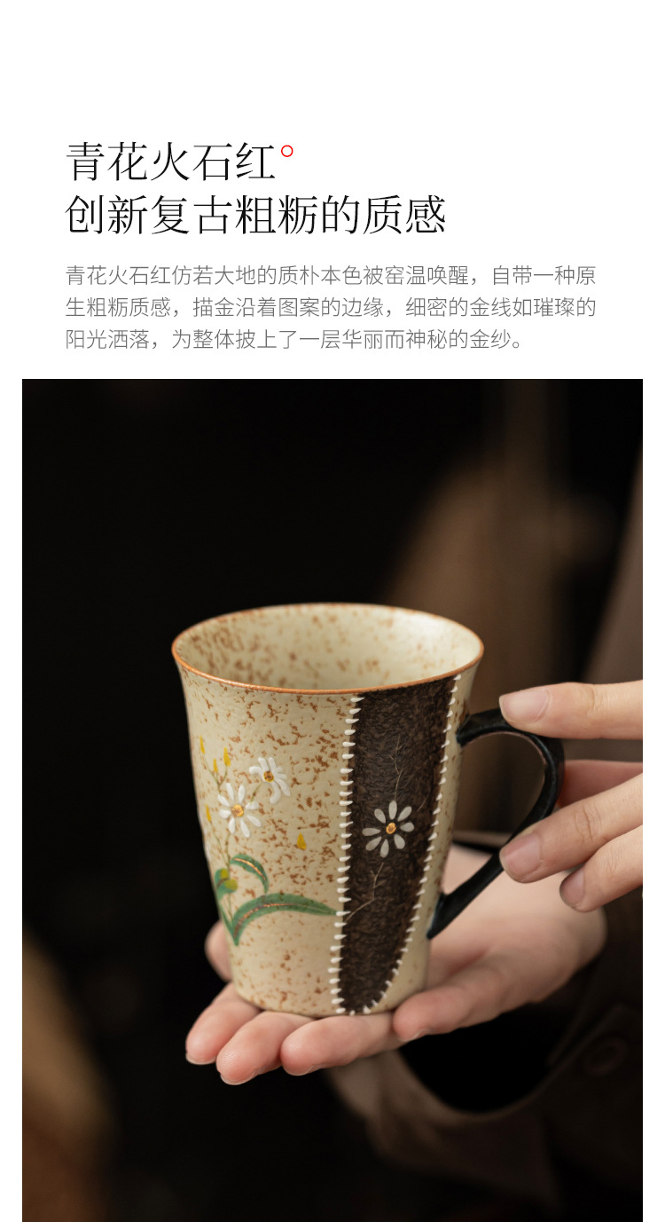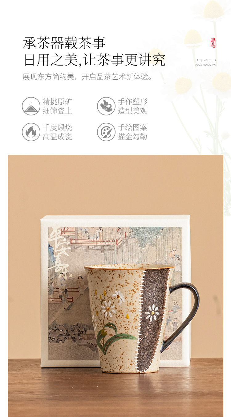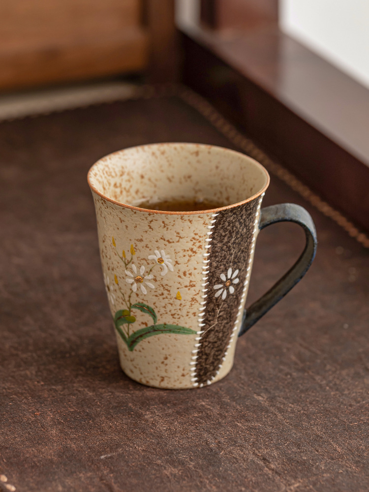 - Ly sứ đỏ nâu xanh trắng, họa tiết hoa cúc vàng vẽ tay, ly cola cao cấp, ly uống nước gia dụng có quai cầm