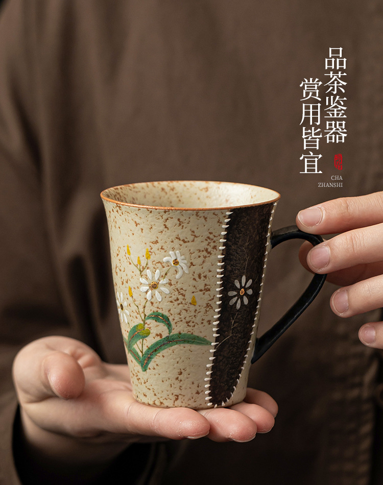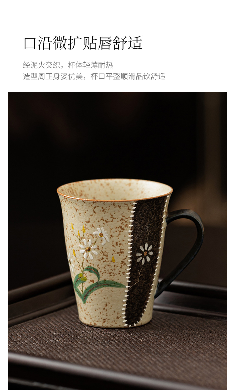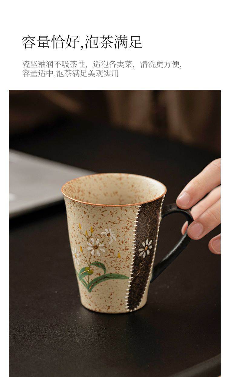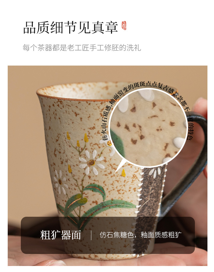 - Ly sứ đỏ nâu xanh trắng, họa tiết hoa cúc vàng vẽ tay, ly cola cao cấp, ly uống nước gia dụng có quai cầm