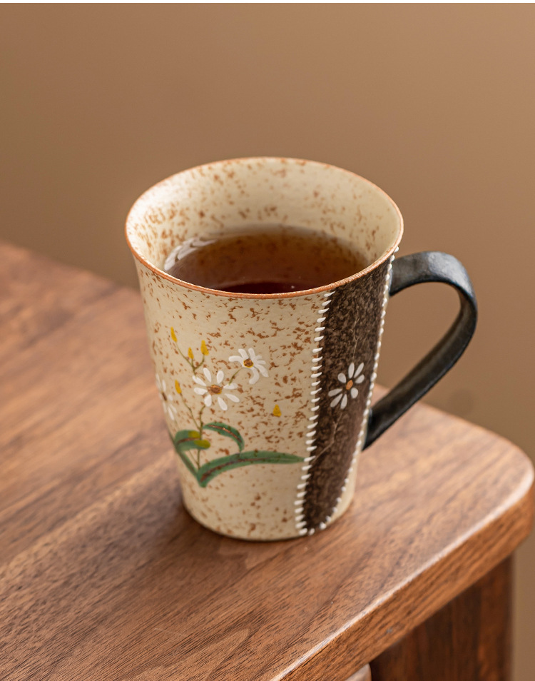 Ly sứ đỏ nâu xanh trắng, họa tiết hoa cúc vàng vẽ tay, ly cola cao cấp, ly uống nước gia dụng có quai cầm