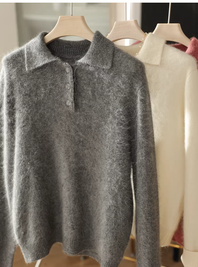 Màu hồng đỏ siêu đẹp! Tuyệt vời để làm sáng tông màu da! Áo len dày dặn cổ polo chất liệu len cừu 100% chải kỹ, dáng rộng dành cho nữ, mùa thu đông.