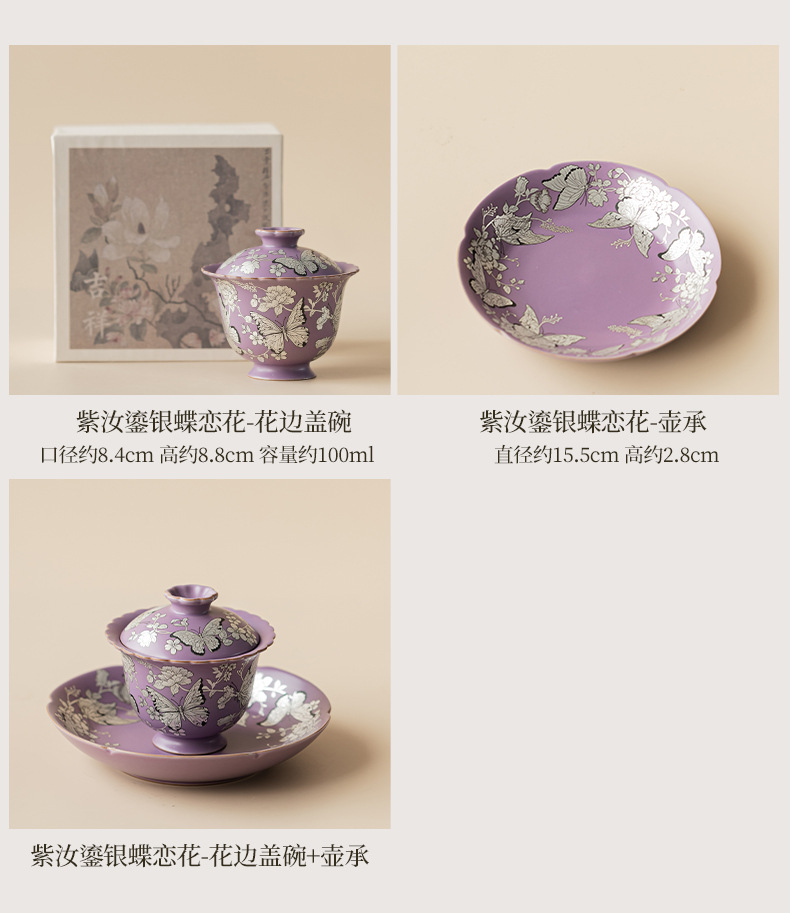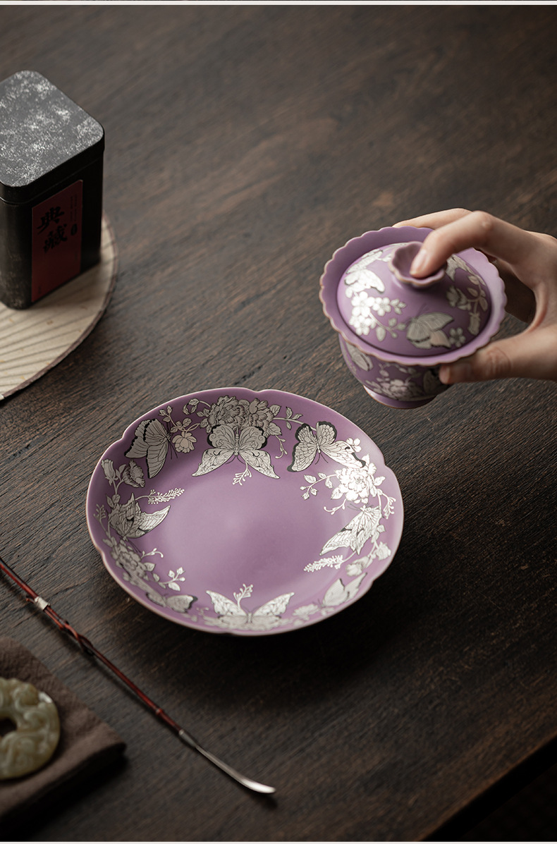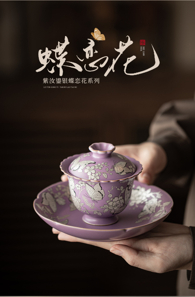 - Màu tím Ru mạ bạc bướm tình yêu hoa ba cái nắp bát đựng trà gốm sứ có nắp tách trà bộ ấm trà có thể nâng cốc trà