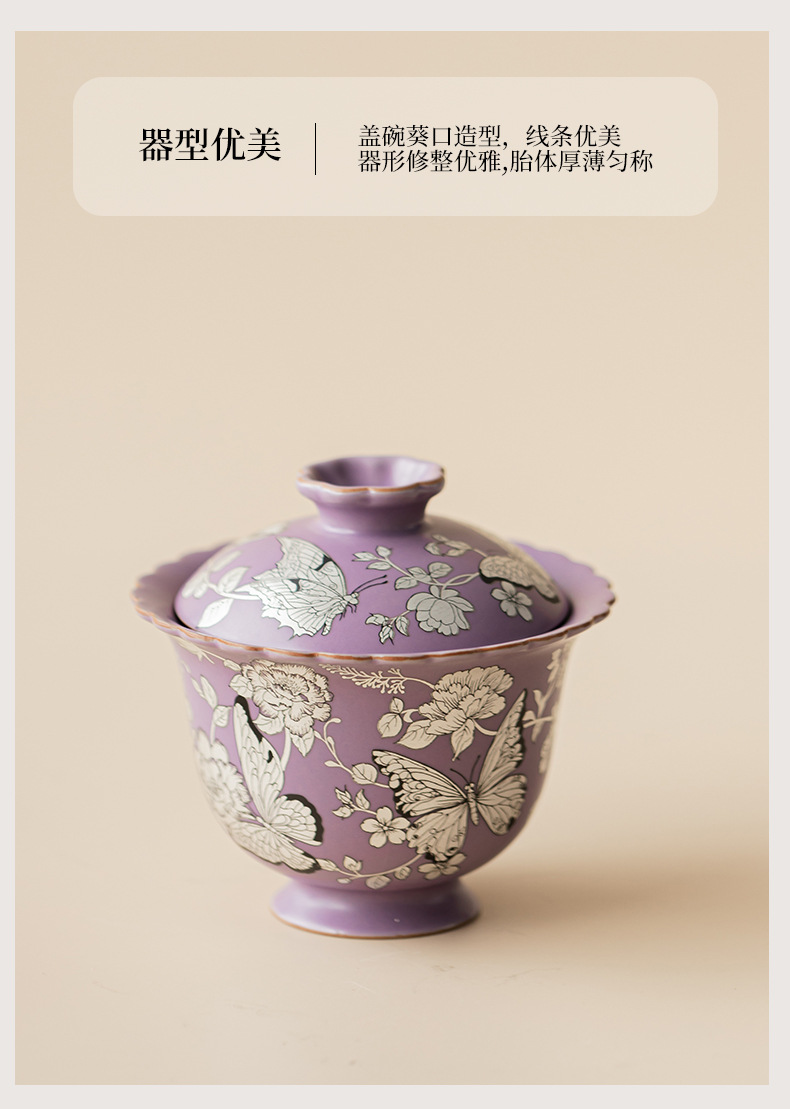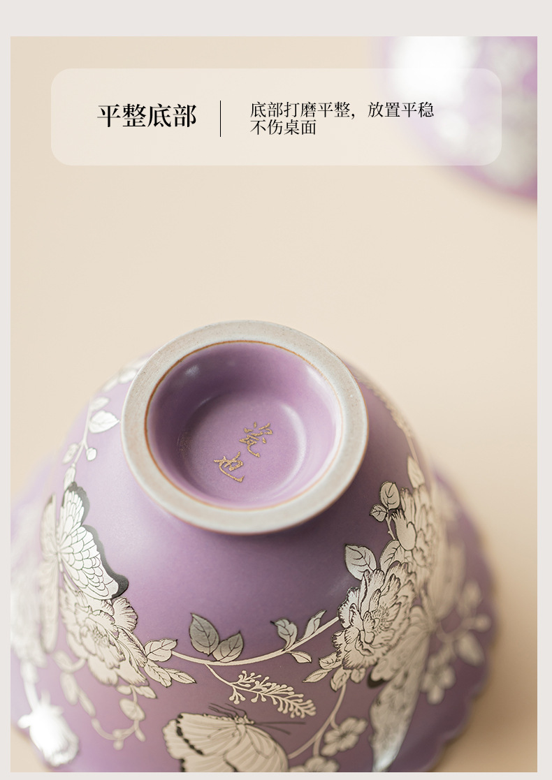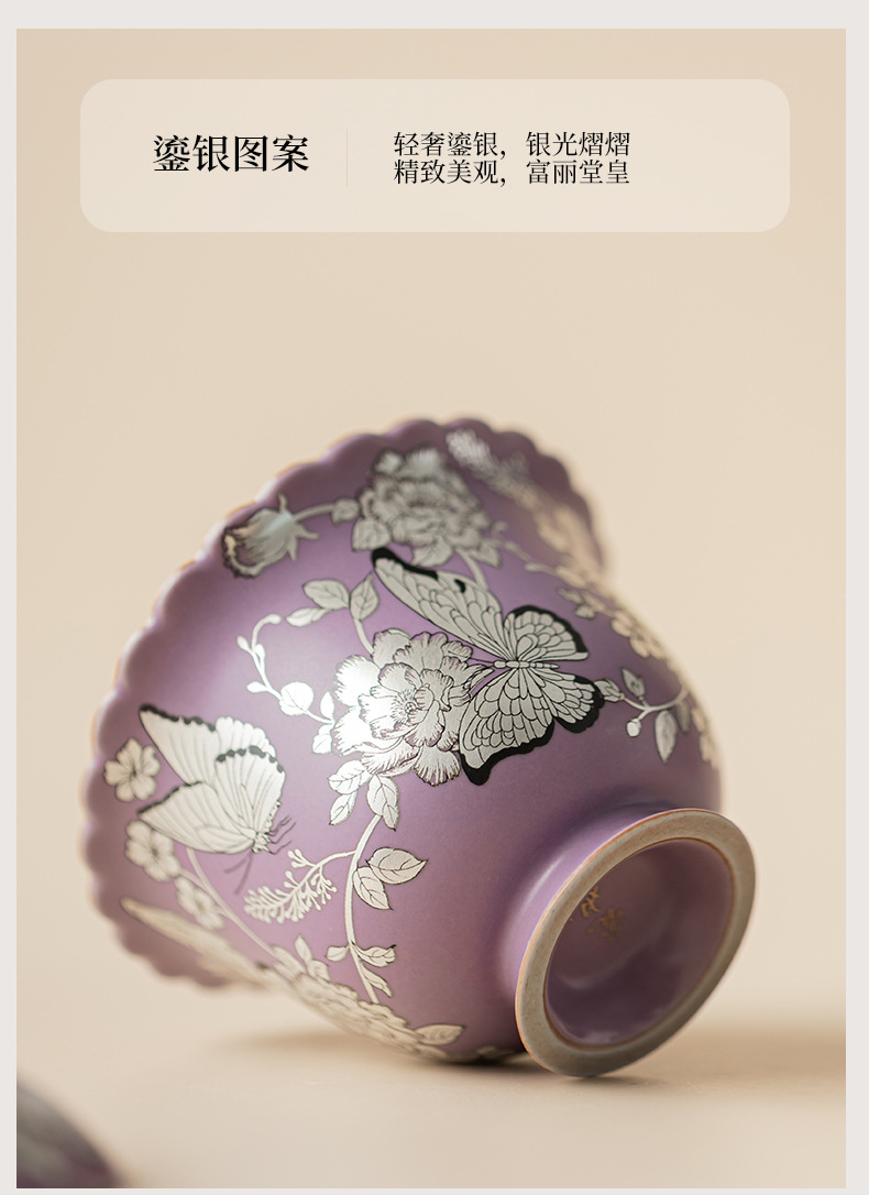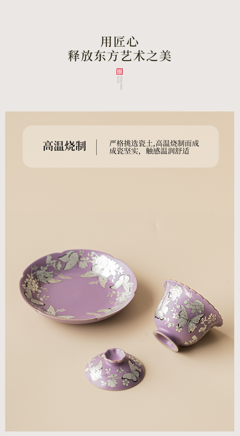 - Màu tím Ru mạ bạc bướm tình yêu hoa ba cái nắp bát đựng trà gốm sứ có nắp tách trà bộ ấm trà có thể nâng cốc trà