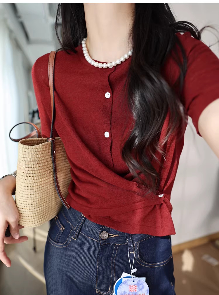 Một chiếc áo, hai cách mặc! Có thể thắt eo để tạo hiệu ứng thon gọn, áo cardigan dệt kim cổ tròn chất liệu linen-cotton thoải mái, áo thun ngắn tay dành cho nữ mùa hè.