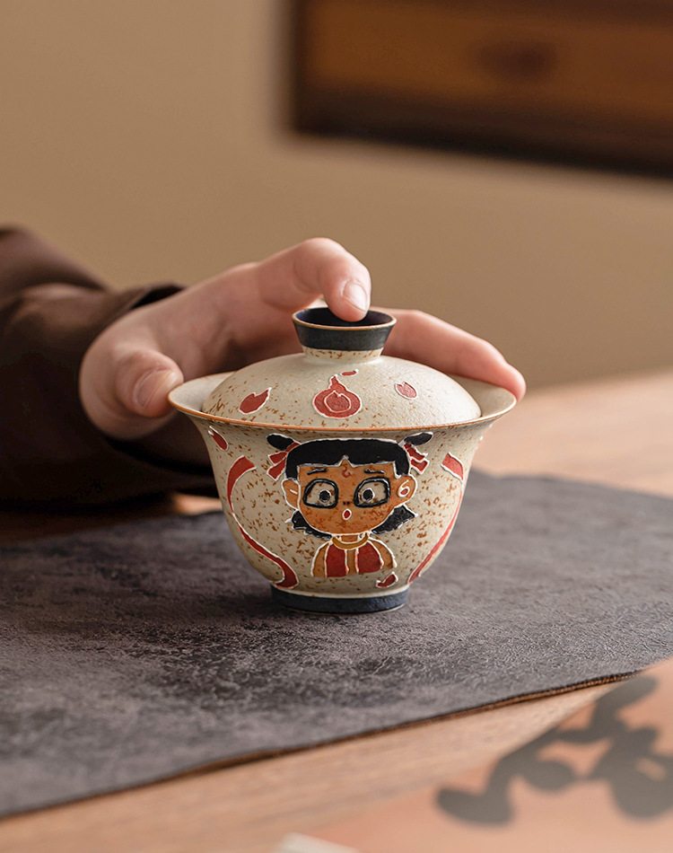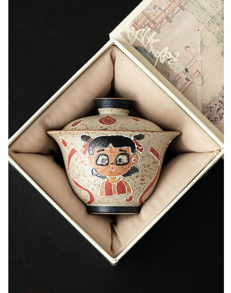 - Nezha Naohai Bát có nắp Cốc trà Đá lửa trắng xanh Gốm sứ đỏ Bát trà nhị tài có nắp Bộ pha trà Kung Fu lớn đơn