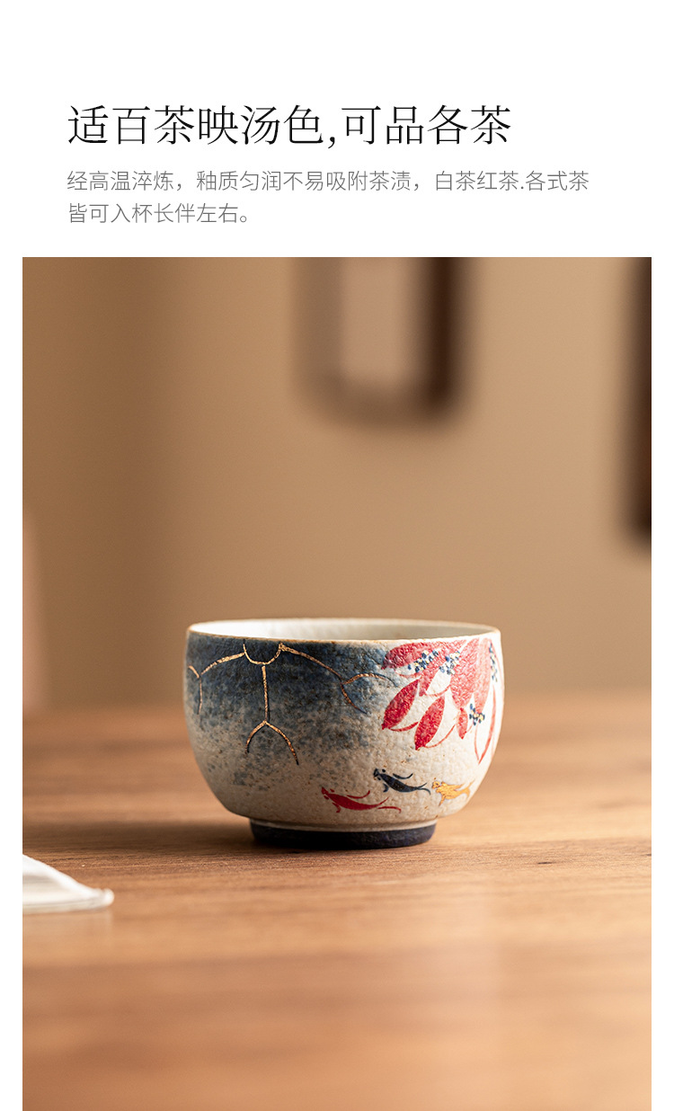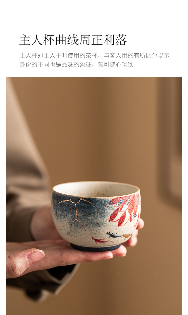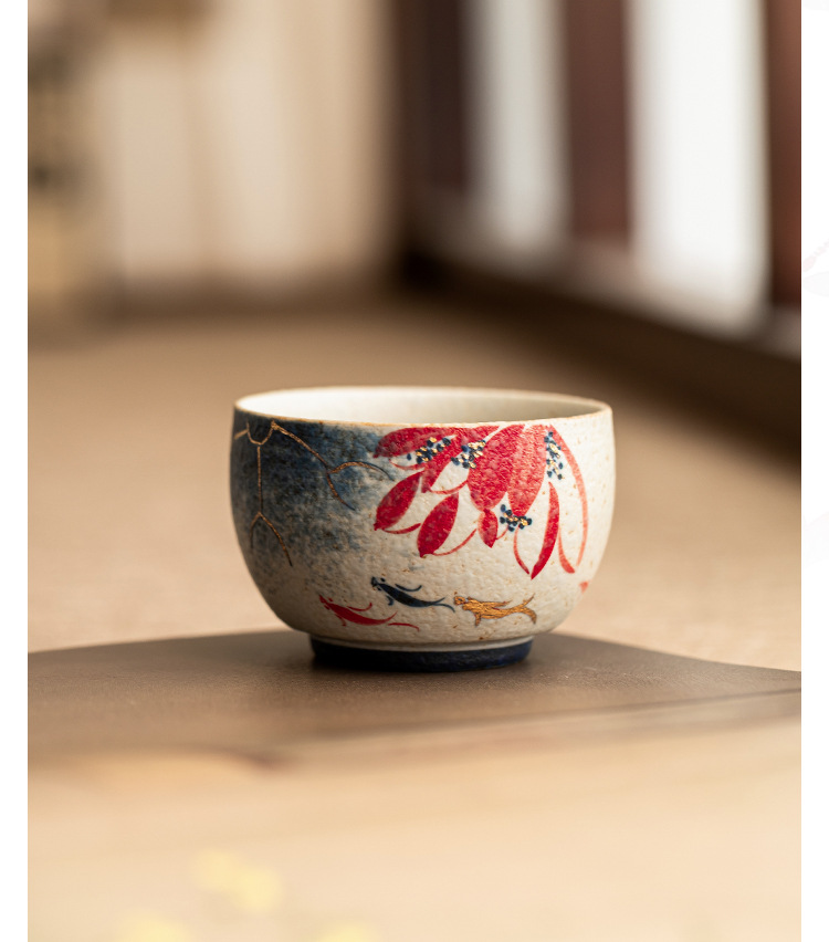 Nhà máy màu xanh và trắng, đá lửa đỏ, cốc chủ nhân, vàng vẽ tay, hoa sen, cá koi, cốc La Hán, cốc trà gốm sứ, cốc trà