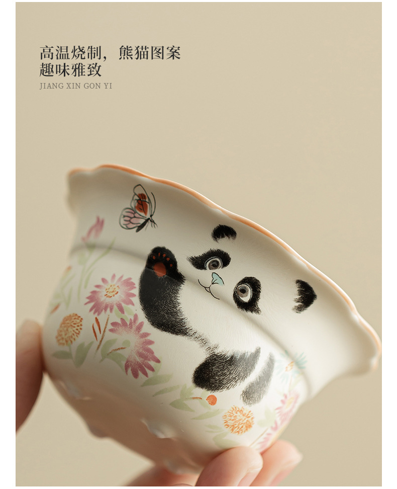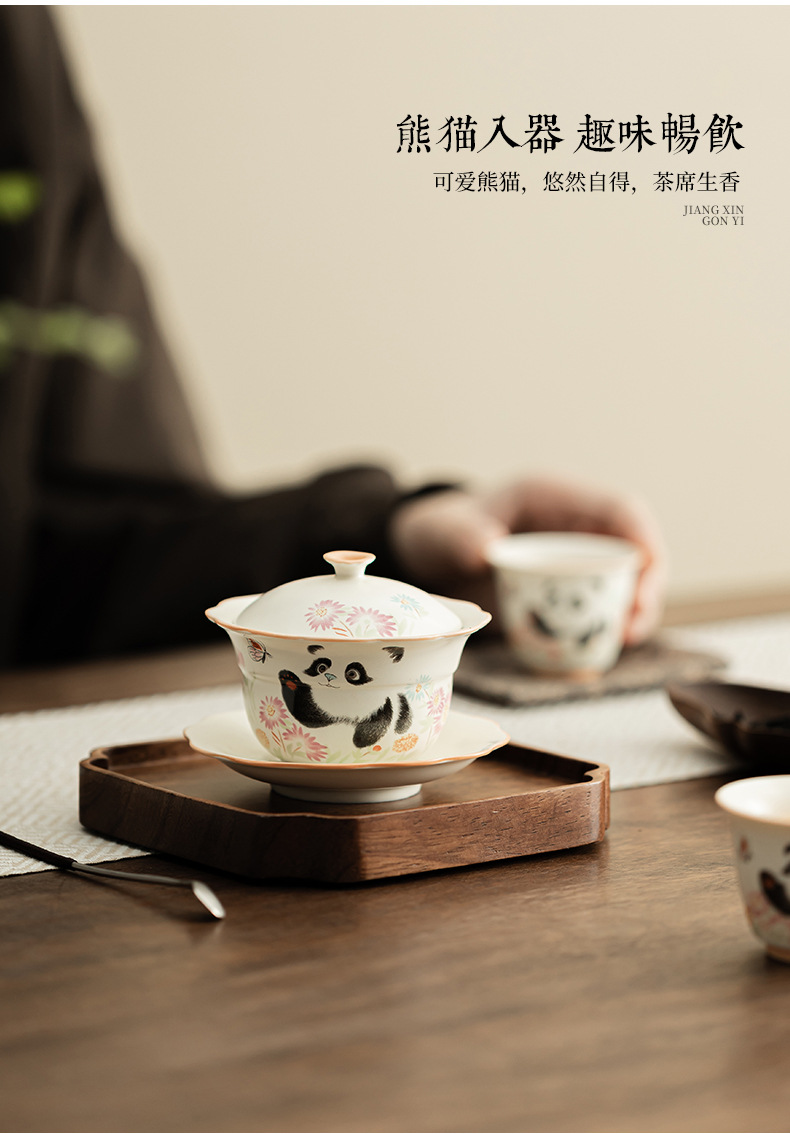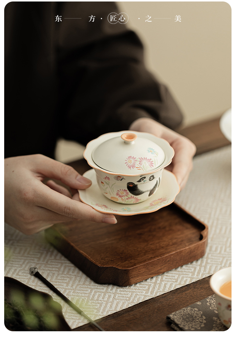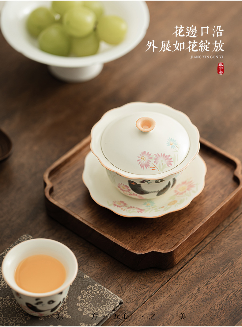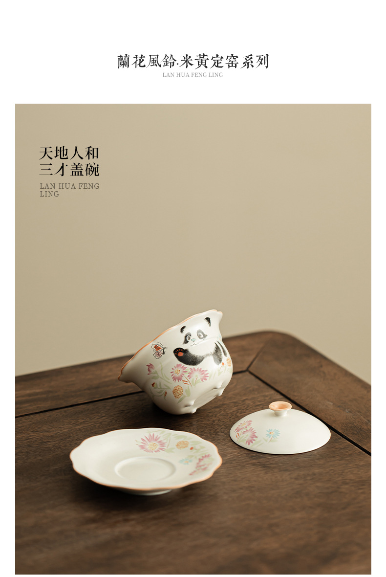 Panda chơi bướm miệng hoa bầu nắp bát màu be gốm sứ Dingyao bát trà ba tài dụng cụ trà cốc trà lớn chống bỏng