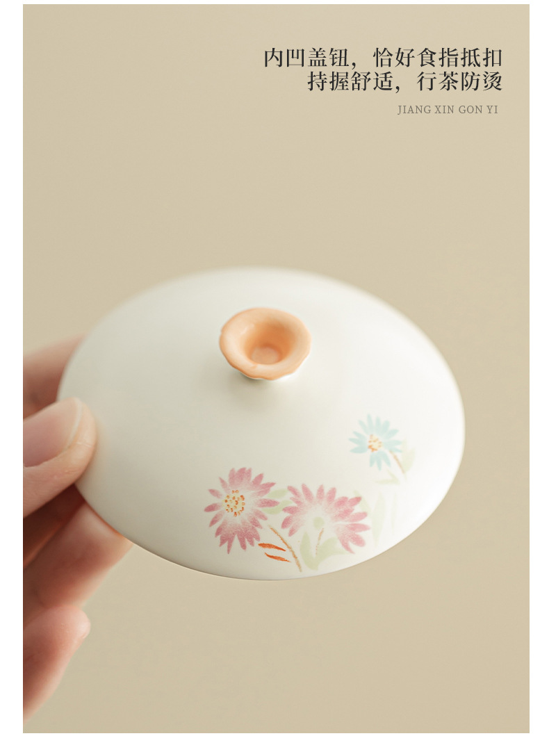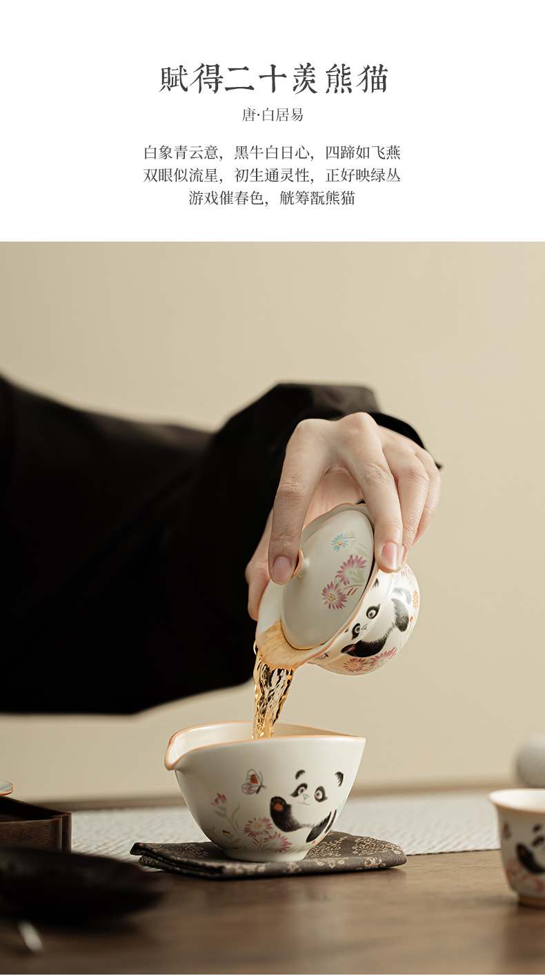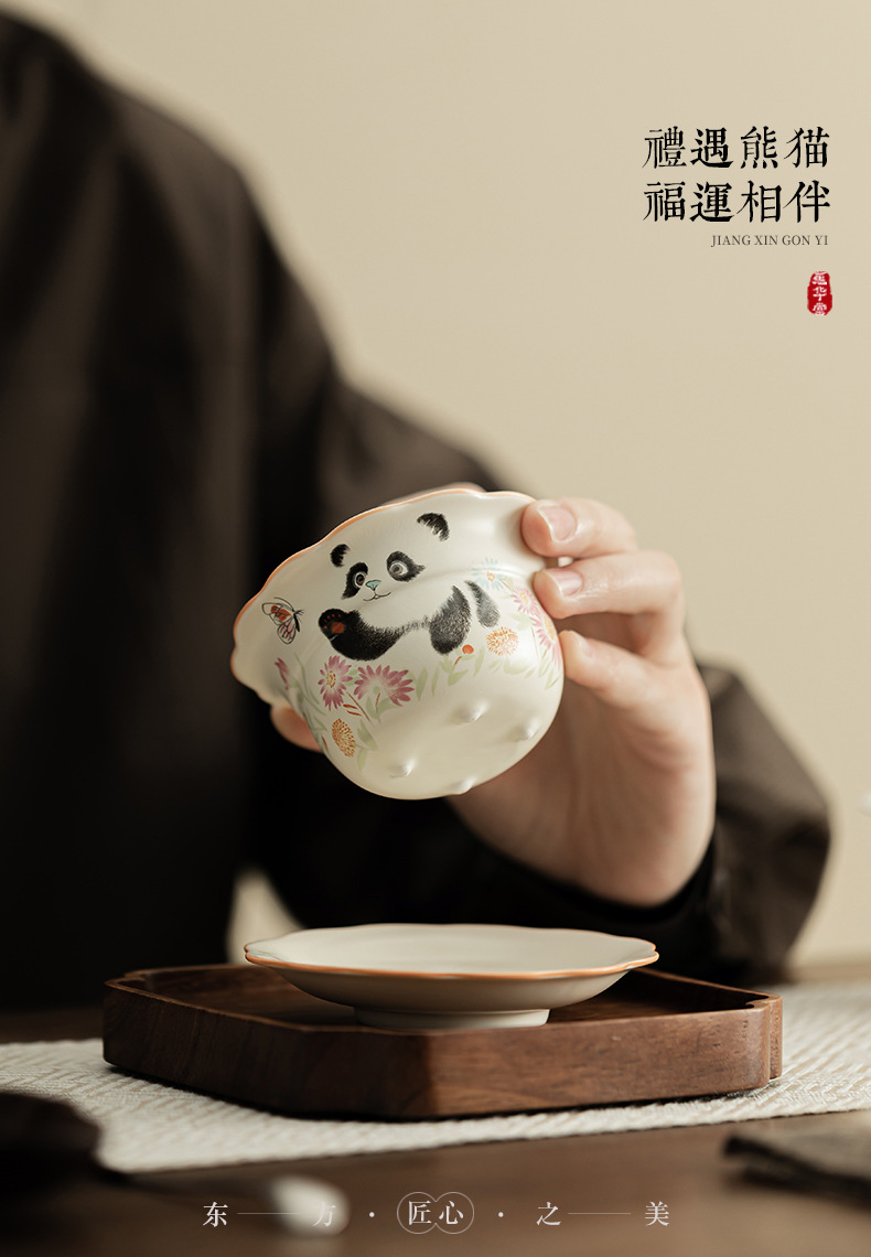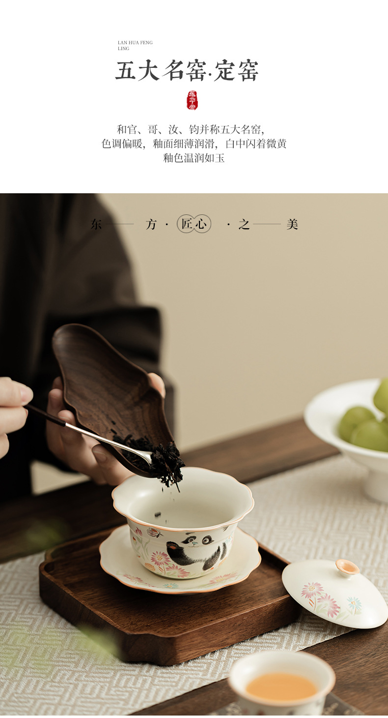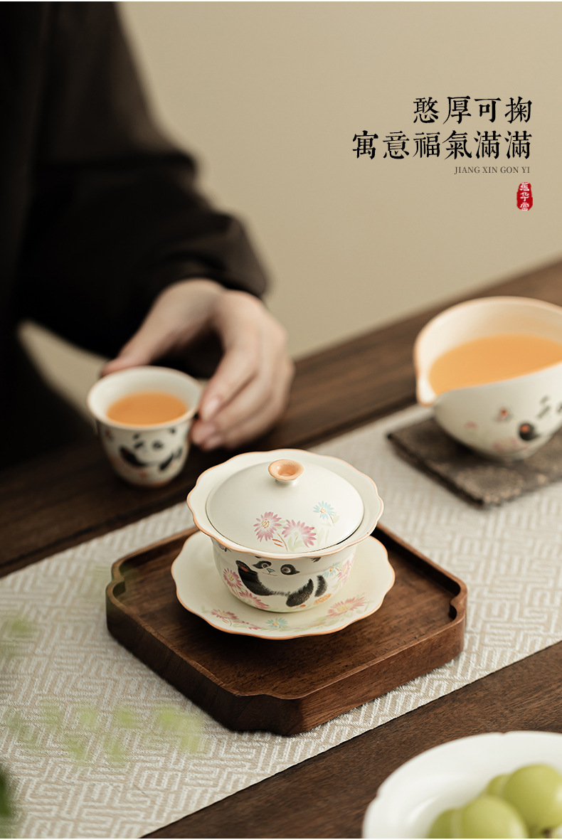 Panda chơi bướm miệng hoa bầu nắp bát màu be gốm sứ Dingyao bát trà ba tài dụng cụ trà cốc trà lớn chống bỏng