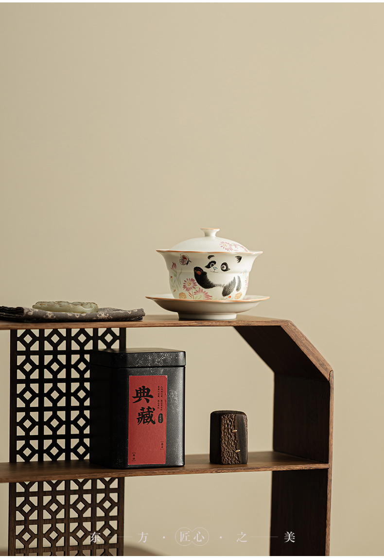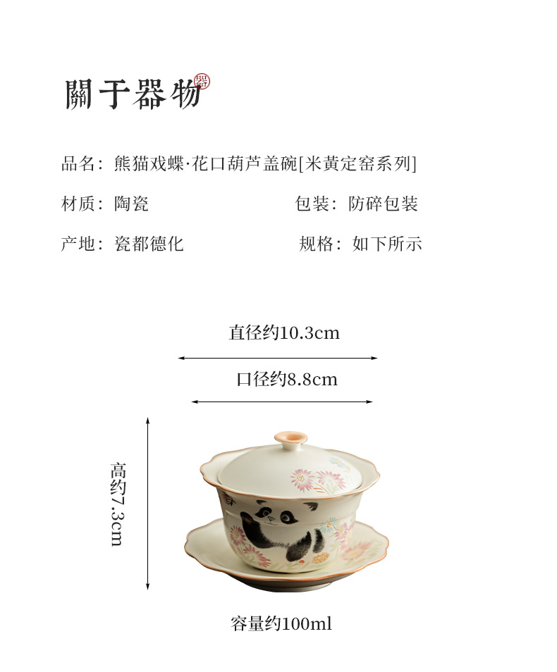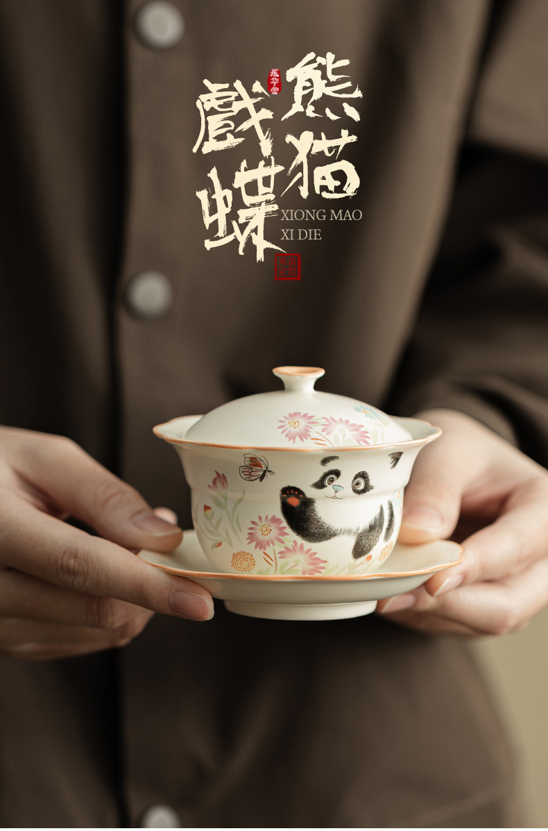 - Panda chơi bướm miệng hoa bầu nắp bát màu be gốm sứ Dingyao bát trà ba tài dụng cụ trà cốc trà lớn chống bỏng