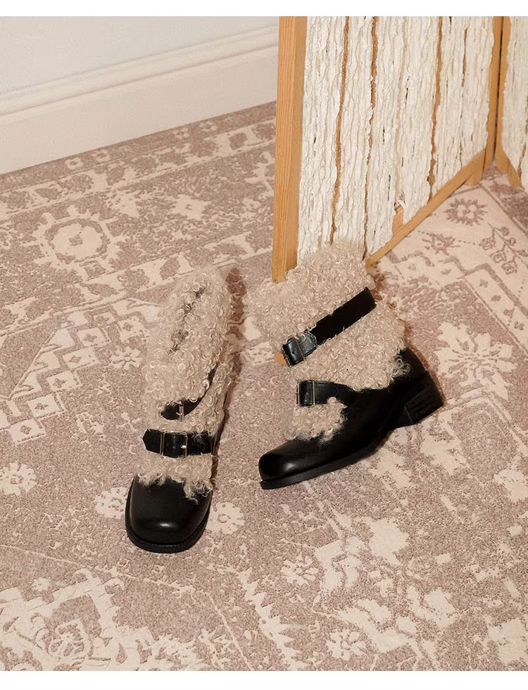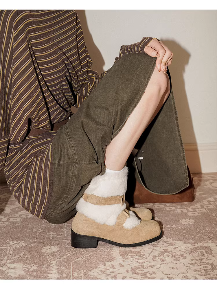 Pear Xiaoqi~ Giày bốt đi tuyết mũi vuông bằng len cừu dành cho nữ, giày bốt cotton ấm áp có khóa thắt lưng mùa đông, giày bốt ngắn lót lông cừu