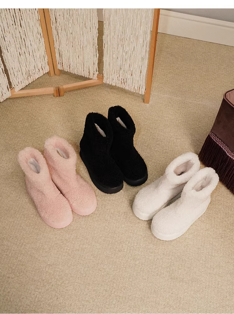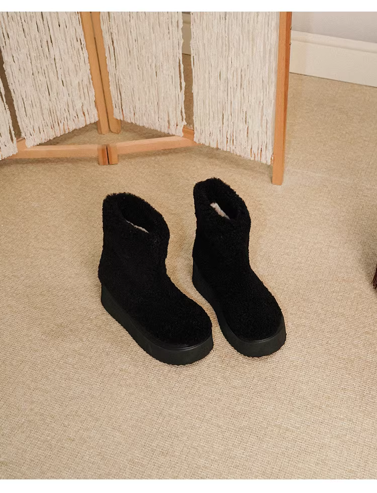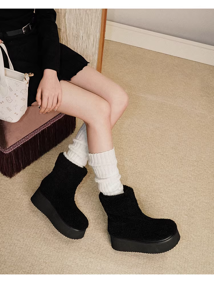Pear Xiaoqi~ Giày bốt thời trang dành cho nữ, đế dày, len cừu, lót lông cừu, ấm áp, mặc ngoài trời, bốt ngắn, bốt cotton đa năng.