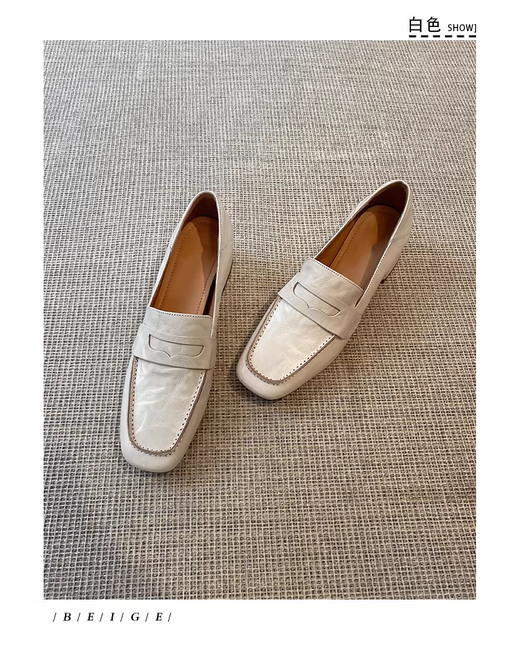 - Pear Xiaoqi~ Giày lười màu trắng dành cho nữ có gót dày, mũi vuông, thích hợp đi làm, da thật, cổ điển, đa năng, giày da nhỏ phong cách Anh quốc