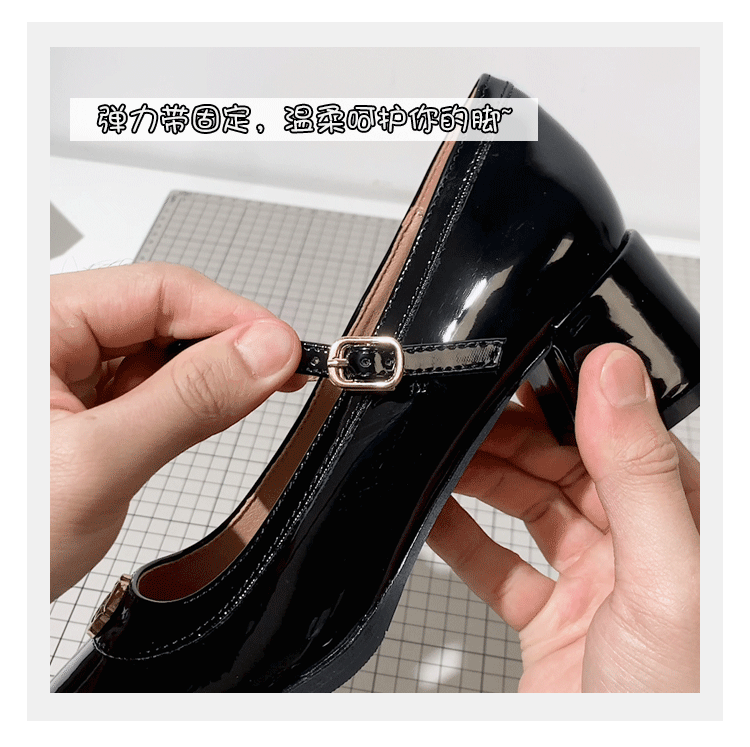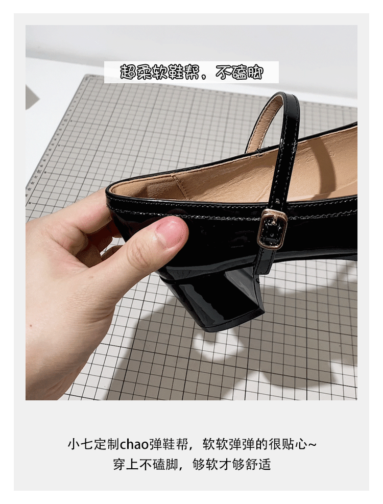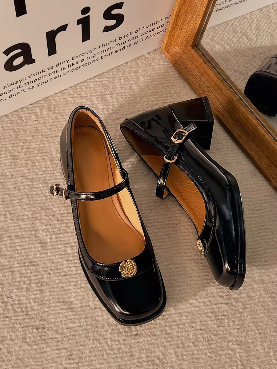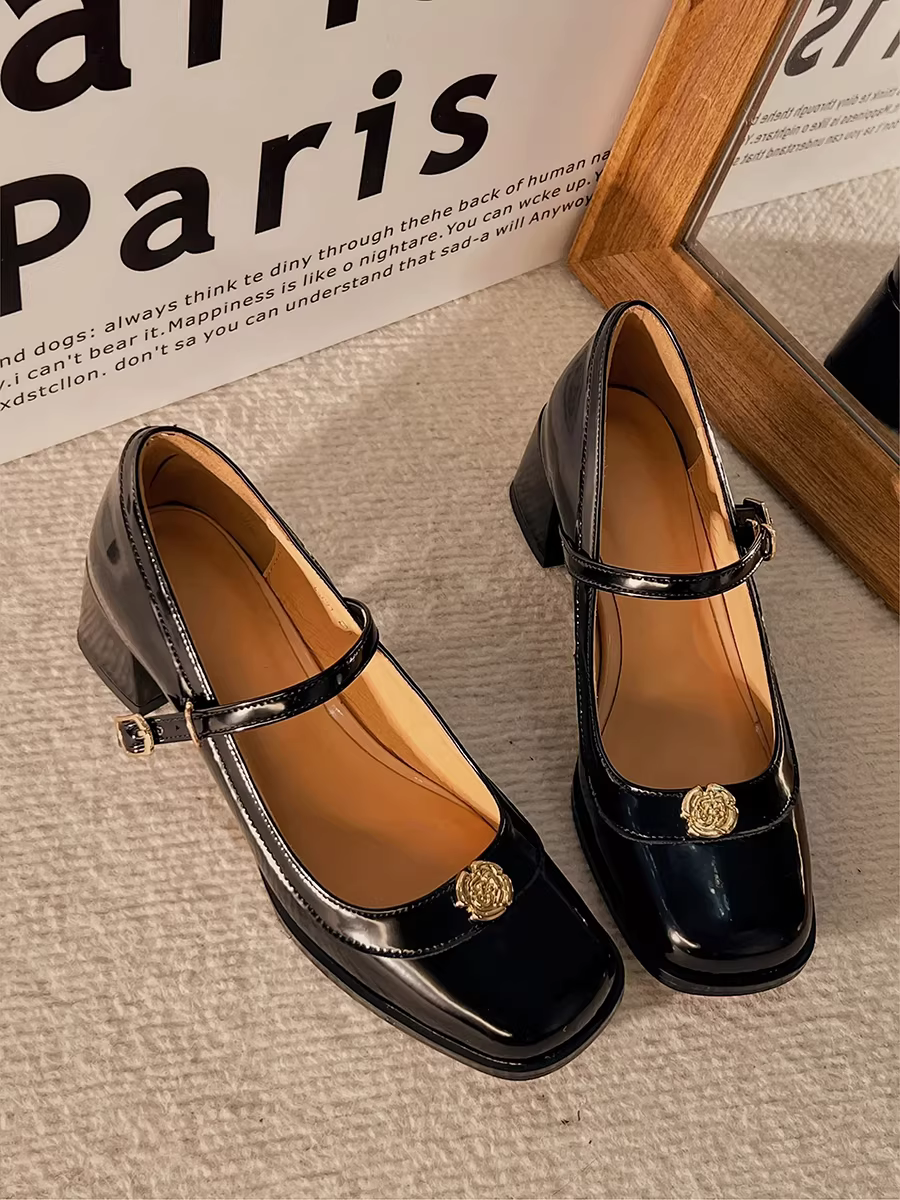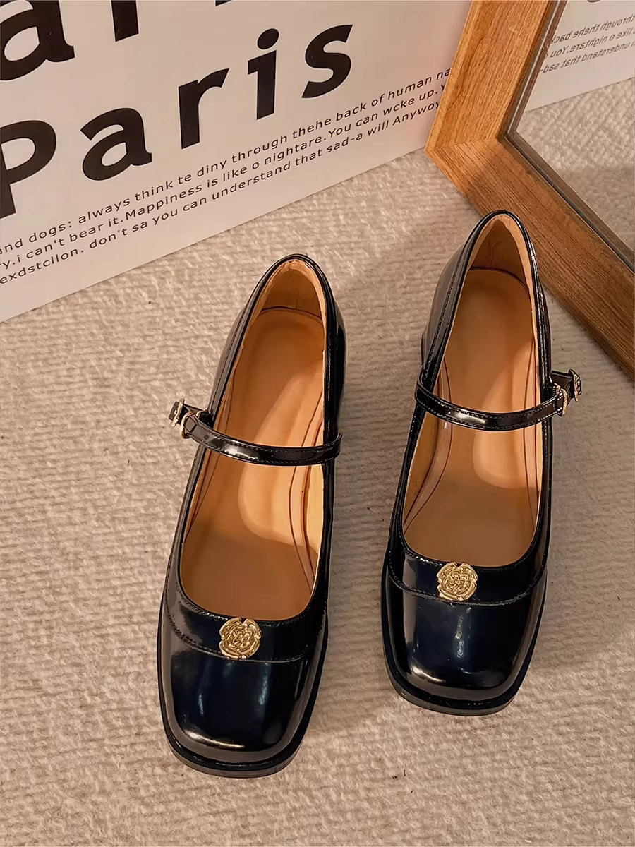 - Pear Xiaoqi~ Giày Mary Jane kiểu Pháp dành cho nữ, giày cao gót, giày đơn gót cao bằng da bóng hình hoa trà, giày da nhỏ kiểu Hepburn JK.