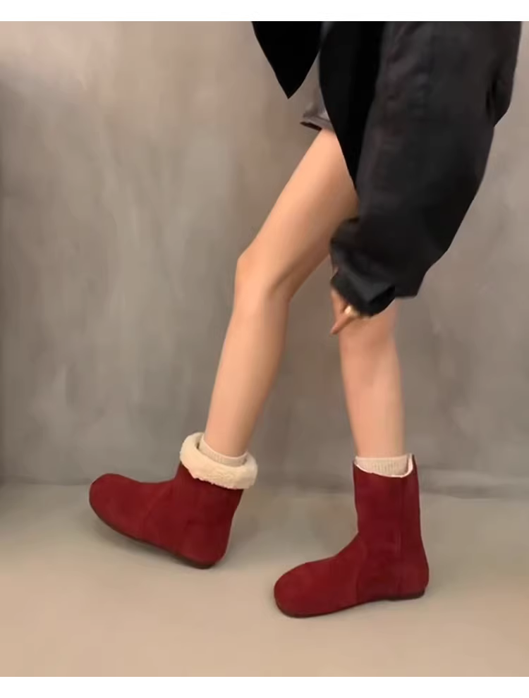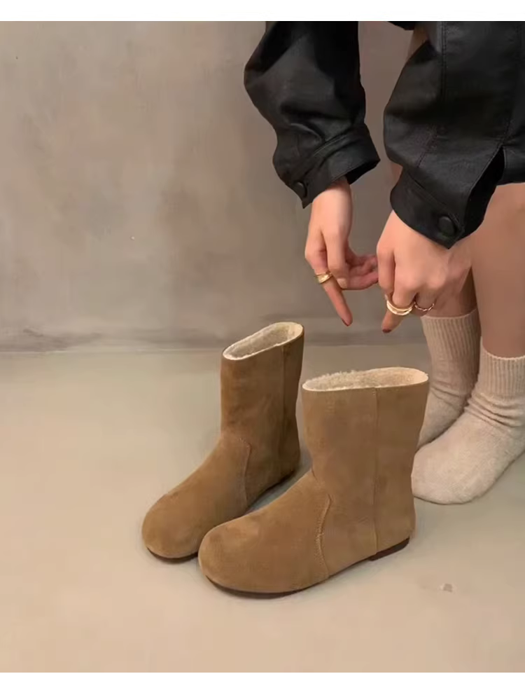- Phiên bản da bò ~ Giày bốt Birkenstock da thật mũi tròn dành cho nữ, bốt ngắn đế bằng lót lông cừu giữ ấm tăng chiều cao, bốt da lộn kiểu cổ điển phương Tây