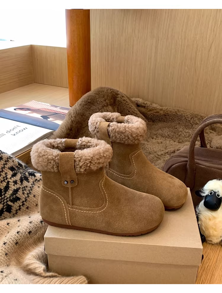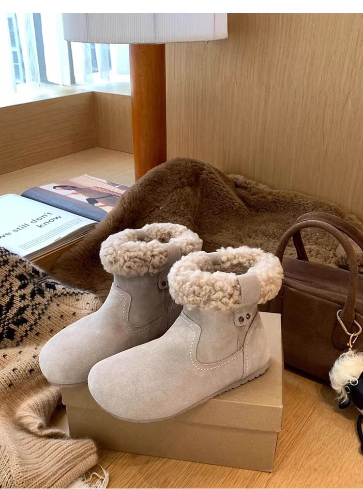 Phiên bản da bò ~ Giày bốt Birkenstock lót lông cừu dành cho nữ, bốt ngắn đế bằng len cừu mùa đông, tích hợp lông thú, ấm áp, chống trượt, đi được trên tuyết