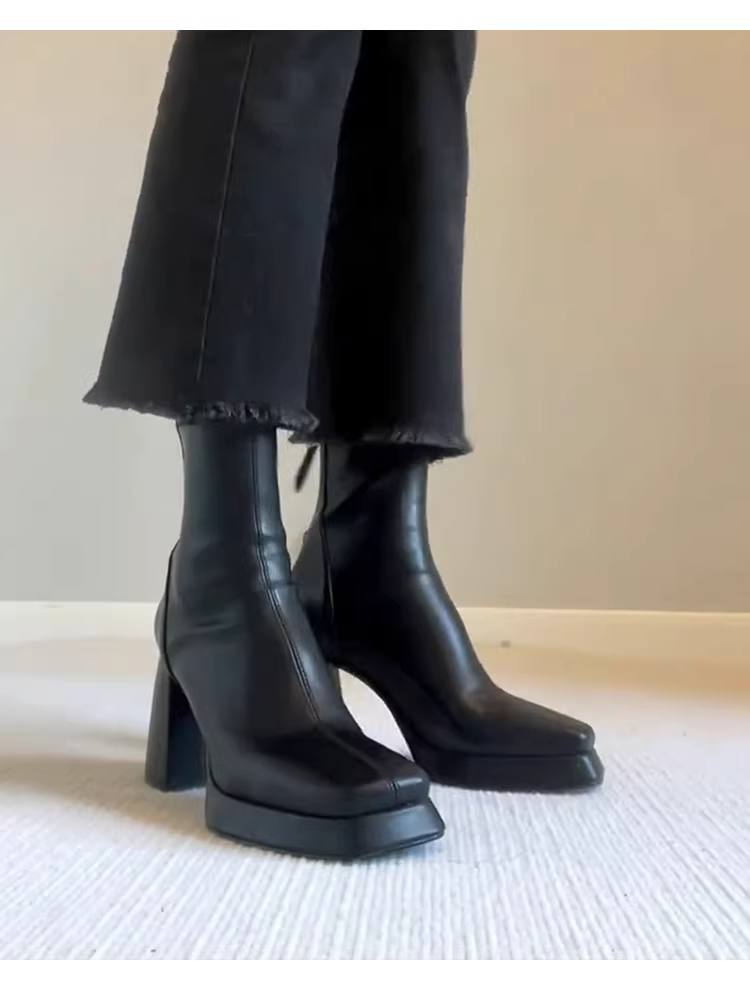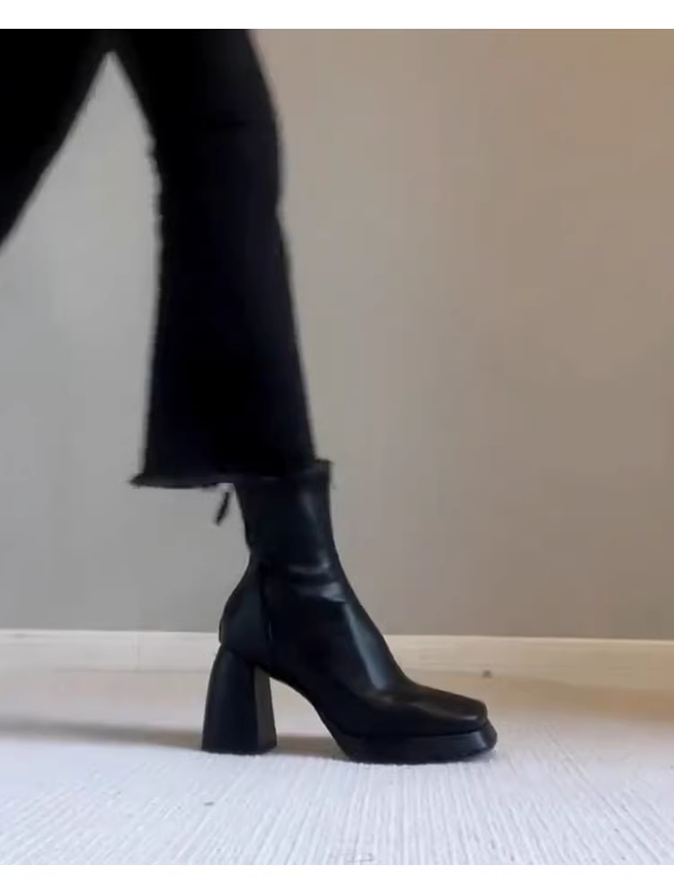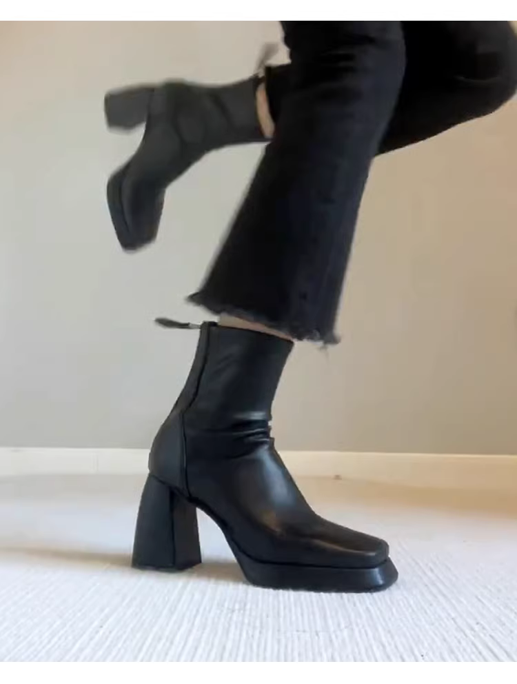 - Phiên bản da bò~ Giày bốt cao gót đế dày chống thấm nước kiểu Pháp dành cho nữ, giày bốt ngắn gót vuông mũi vuông màu đen có khóa kéo phía sau