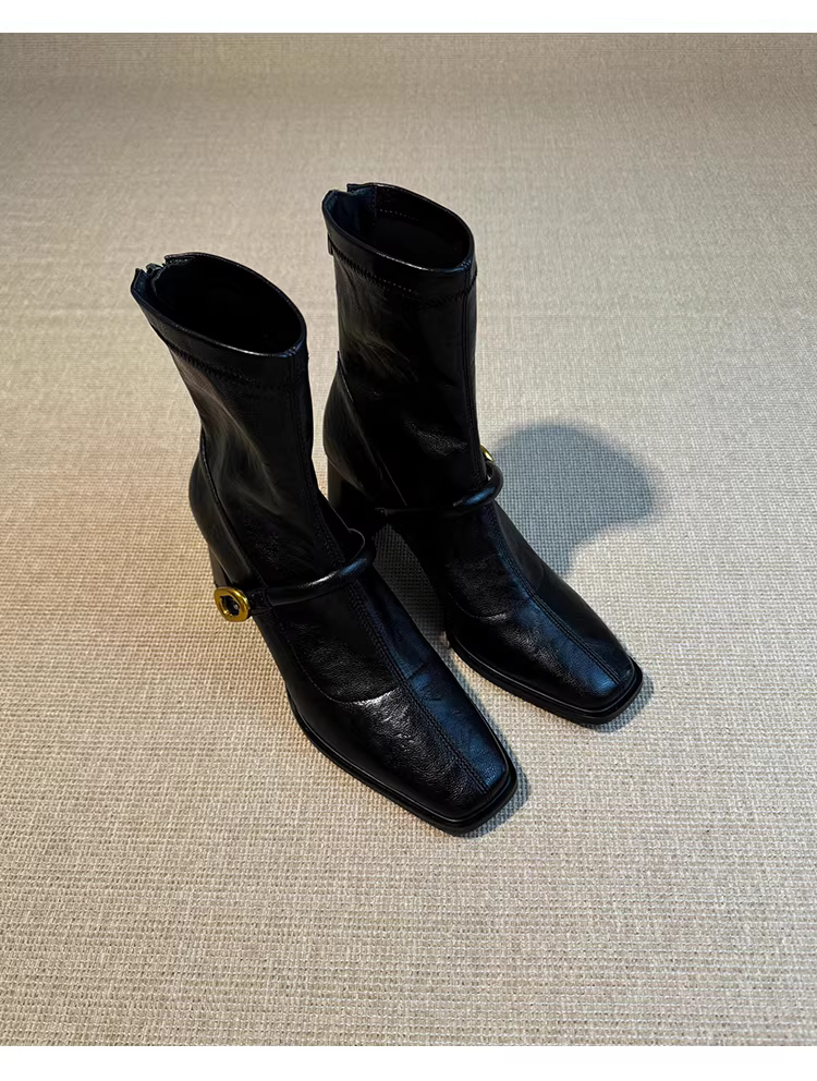 Phiên bản da bò ~ Giày bốt cao gót mũi vuông dành cho nữ, gót vuông kiểu Pháp, khóa kéo phía sau kiểu cổ điển, bốt ngắn bằng da thật, bốt thời trang co giãn.