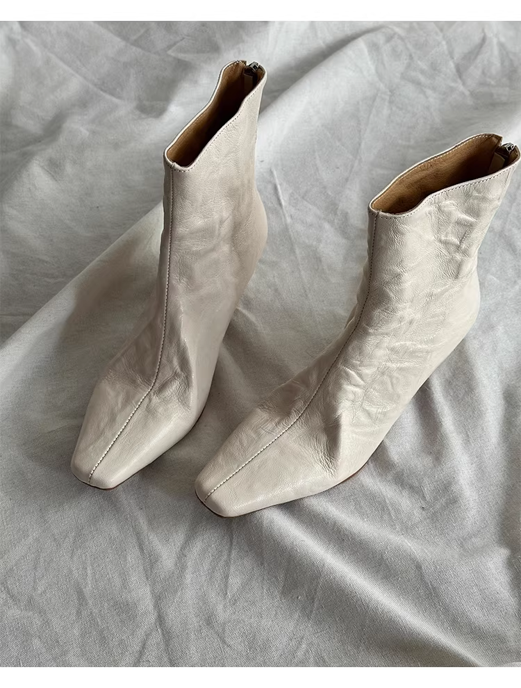 - Phiên bản da bò~ Giày bốt cổ ngắn cao gót da thật màu trắng phong cách Pháp dành cho nữ, mũi vuông, khóa kéo phía sau, giày bốt thời trang tối giản, thanh lịch, tôn dáng