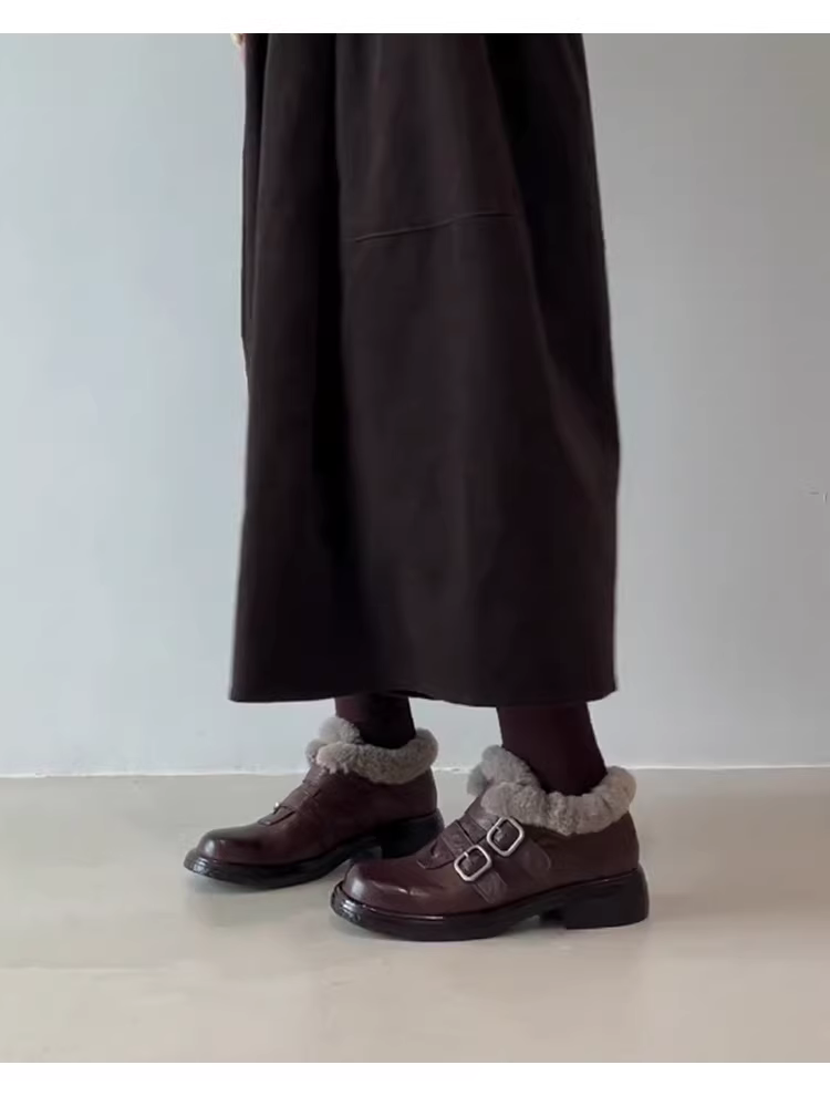 Phiên bản da bò ~ Giày bốt cổ ngắn có khóa đôi bằng da thật thời trang dành cho nữ, giày bốt cổ ngắn có đế dày lót lông cừu cổ điển, giày bốt cotton.