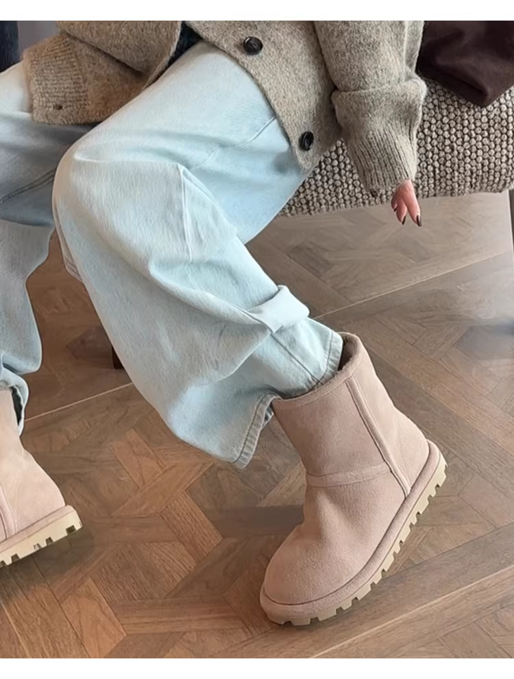 Phiên bản da bò ~ Giày bốt cotton cỡ lớn giữ ấm mùa đông dành cho nữ, da lộn, đế dày, mũi vuông, lót lông cừu, ấm áp và thoải mái, thích hợp để mặc ngoài trời, ủng đi tuyết.