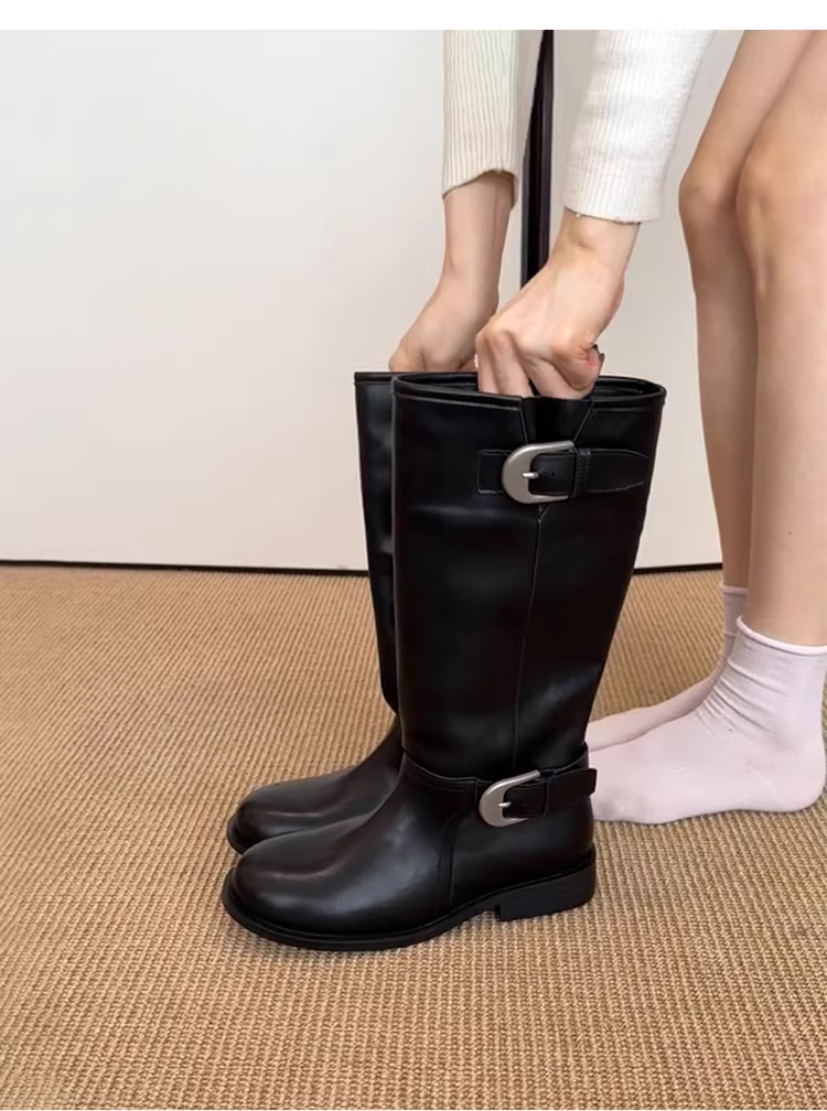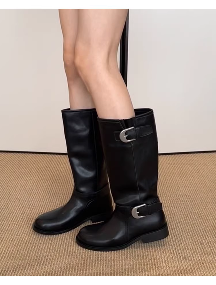 - Phiên bản da bò ~ Giày bốt cưỡi ngựa đế dày ống rộng bằng da thật dành cho nữ, phong cách Anh quốc, cổ điển, tôn dáng, có khóa thắt lưng, bốt dài qua đầu gối