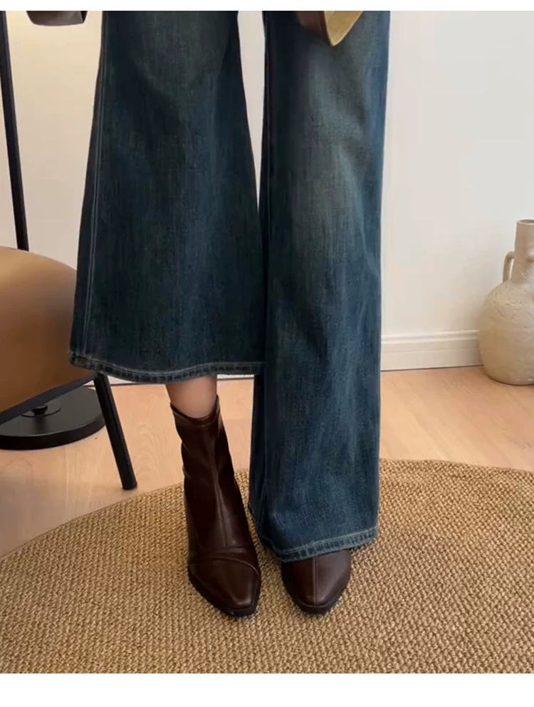 Phiên bản da bò ~ Giày bốt da thật kiểu dáng tối giản, thanh lịch dành cho nữ, mũi nhọn, gót dày, khóa kéo phía sau, giúp thon gọn, đa năng, giày bốt ngắn đi làm.