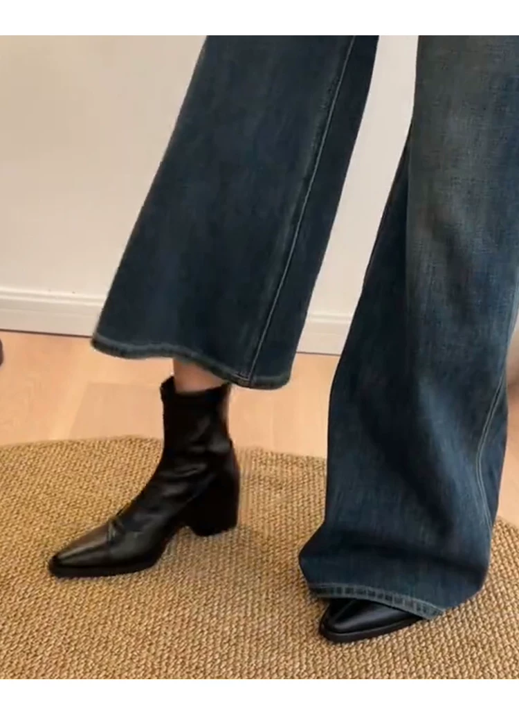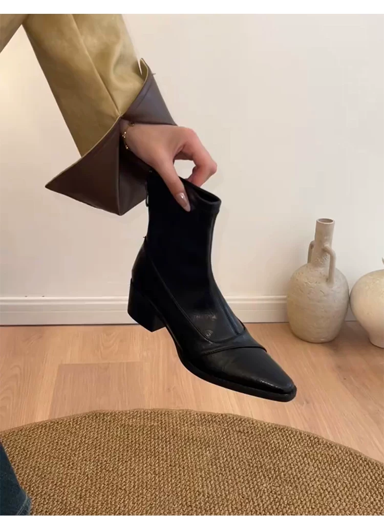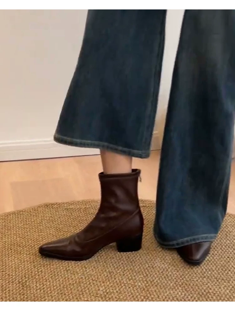 - Phiên bản da bò ~ Giày bốt da thật kiểu dáng tối giản, thanh lịch dành cho nữ, mũi nhọn, gót dày, khóa kéo phía sau, giúp thon gọn, đa năng, giày bốt ngắn đi làm.