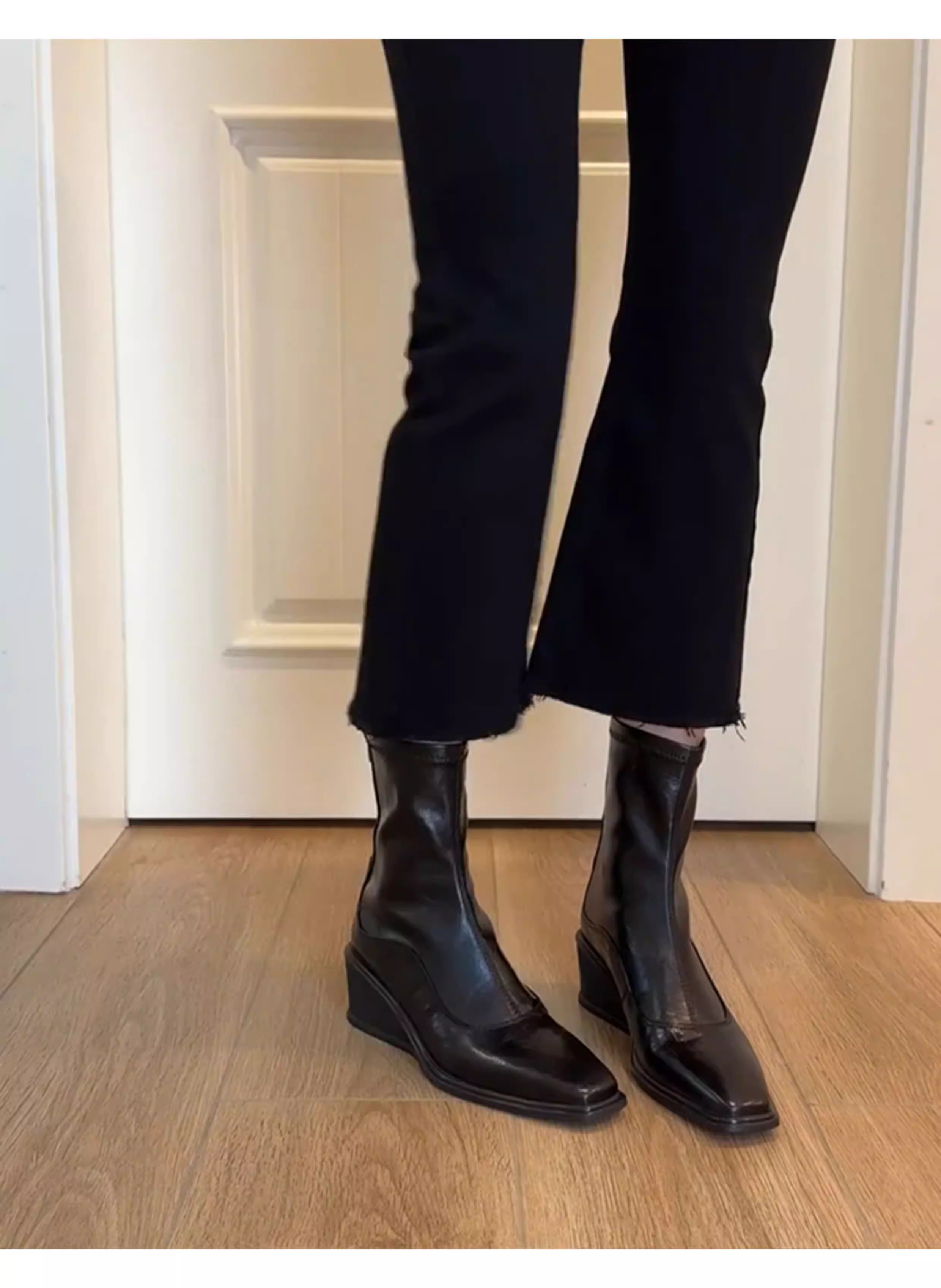 - Phiên bản da bò ~ Giày bốt da thật kiểu dáng vuông mũi, tăng chiều cao, kiểu dáng thời trang, chất liệu da thật co giãn, kiểu dáng ôm sát, có gót wedge và khóa kéo phía sau, kiểu dáng cổ điển đơn giản dành cho nữ.