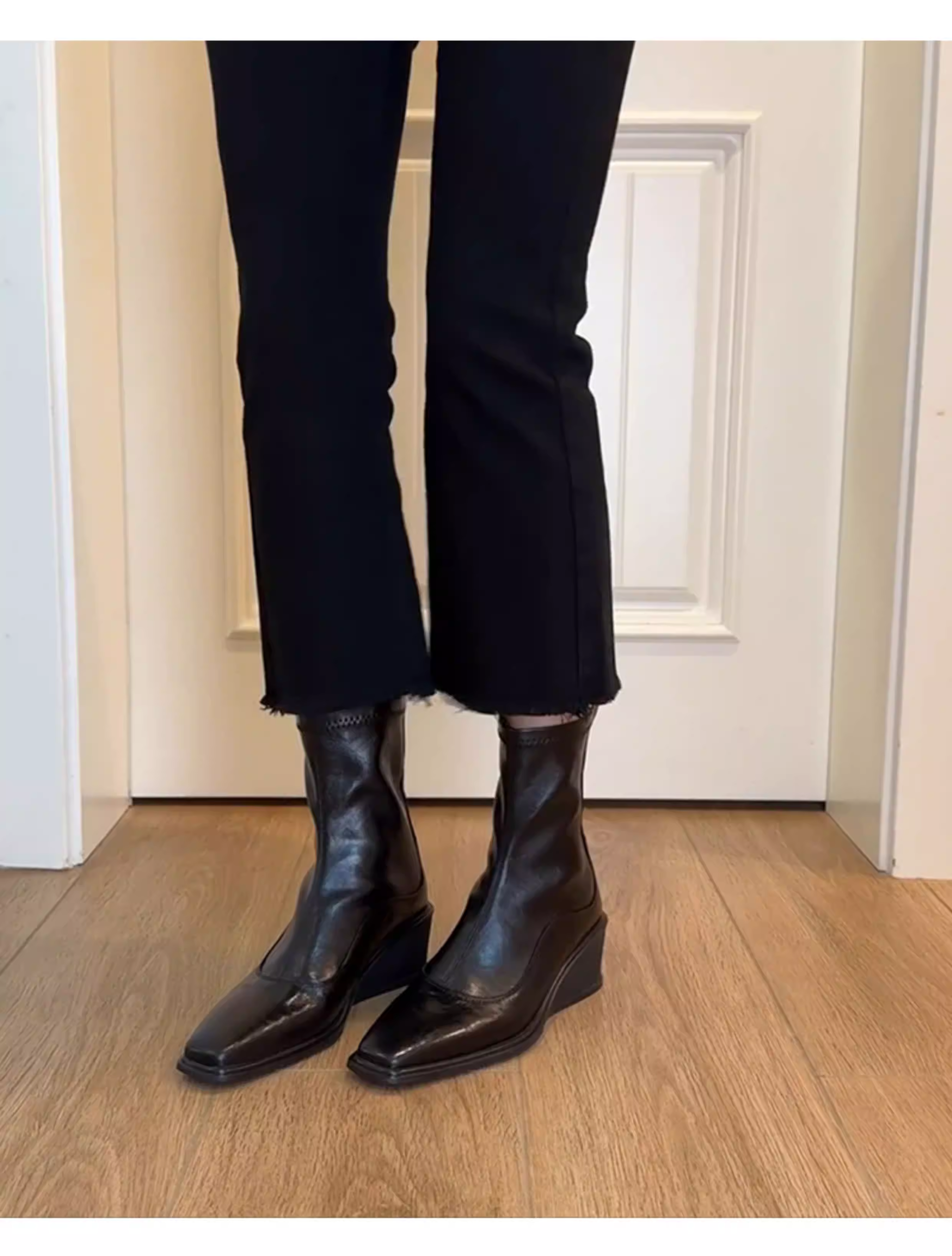 Phiên bản da bò ~ Giày bốt da thật kiểu dáng vuông mũi, tăng chiều cao, kiểu dáng thời trang, chất liệu da thật co giãn, kiểu dáng ôm sát, có gót wedge và khóa kéo phía sau, kiểu dáng cổ điển đơn giản dành cho nữ.