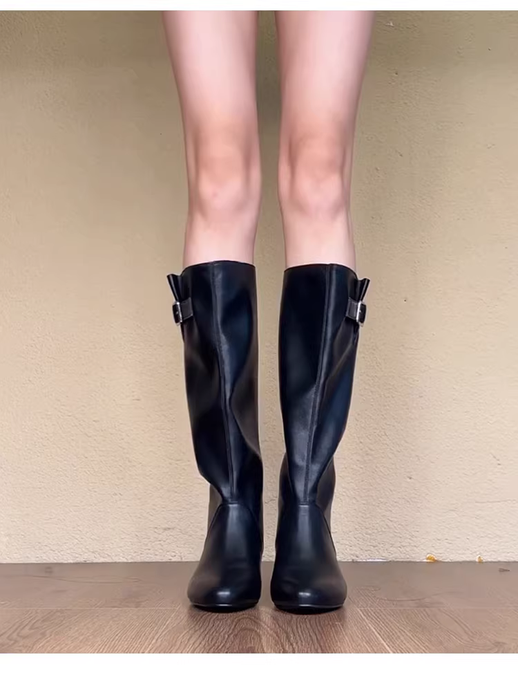 Phiên bản da bò ~ Giày bốt dài da thật cổ điển dành cho nữ, kiểu dáng mới đơn giản với thiết kế tăng chiều cao ẩn, mũi tròn, khóa thắt lưng, bốt cao cổ.
