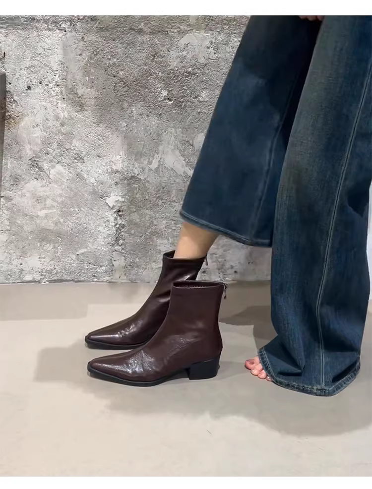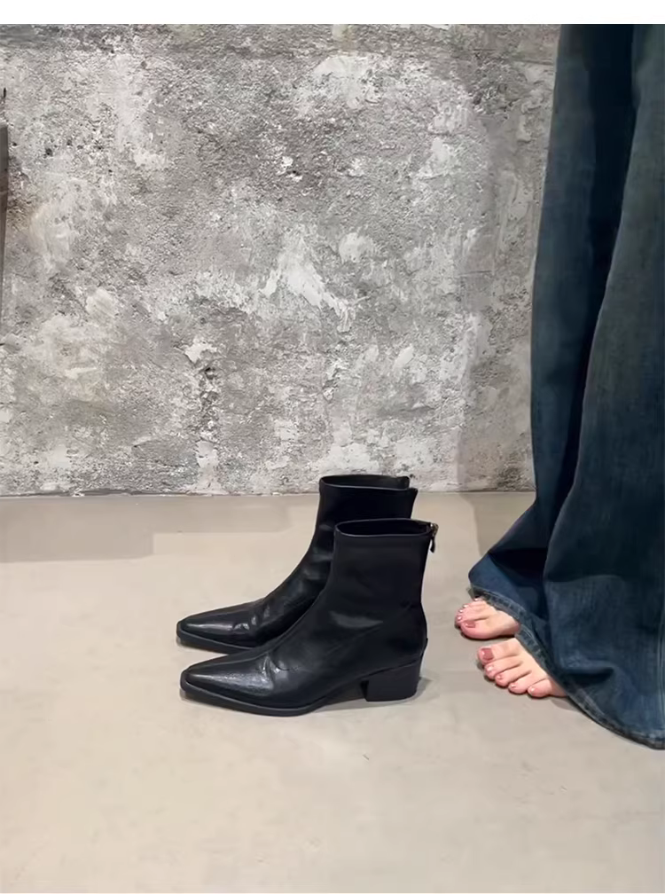 Phiên bản da bò ~ Giày bốt đế dày đa năng, thời trang, kiểu dáng thanh lịch dành cho nữ, kiểu dáng cổ điển đơn giản, khóa kéo phía sau, giúp thon gọn, giày bốt ngắn thời trang