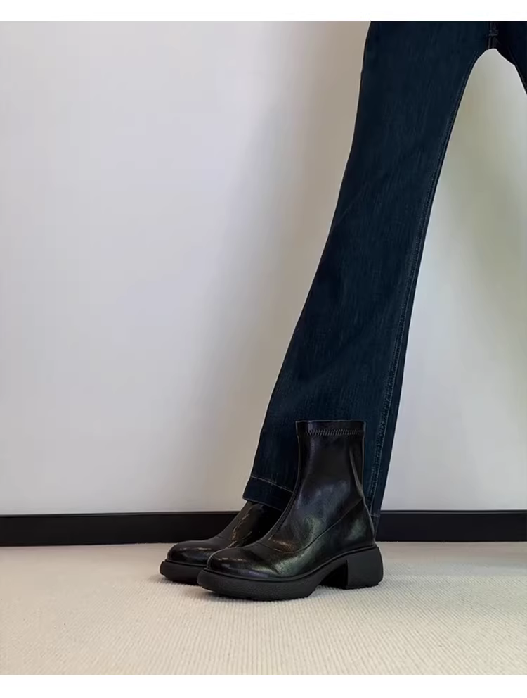 Phiên bản da bò ~ Giày bốt đế dày kiểu Anh cổ điển, êm ái khi đi làm, co giãn, kiểu dáng ôm sát dành cho nữ, có khóa kéo bên hông, kiểu dáng đơn giản và thoải mái.
