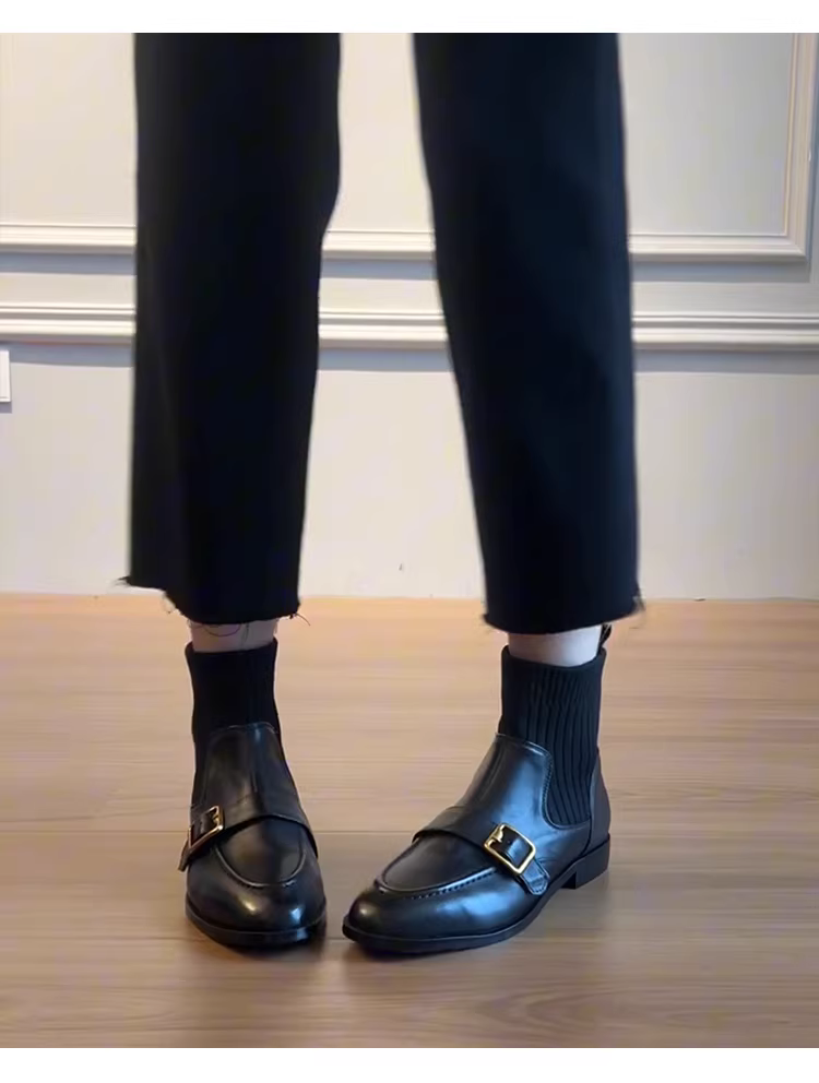 - Phiên bản da bò ~ Giày bốt đế thấp có khóa da thật phong cách Anh Pháp dành cho nữ, giày bốt cổ ngắn co giãn kiểu dáng ôm dáng đi làm