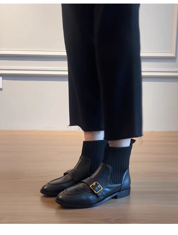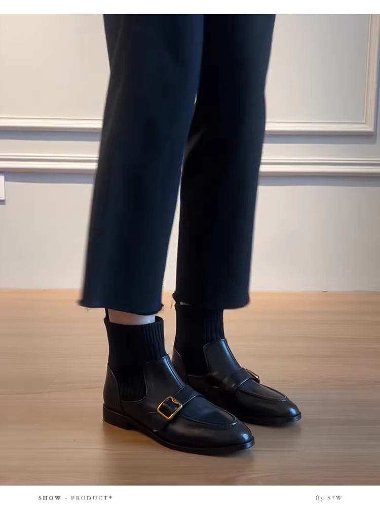 Phiên bản da bò ~ Giày bốt đế thấp có khóa da thật phong cách Anh Pháp dành cho nữ, giày bốt cổ ngắn co giãn kiểu dáng ôm dáng đi làm