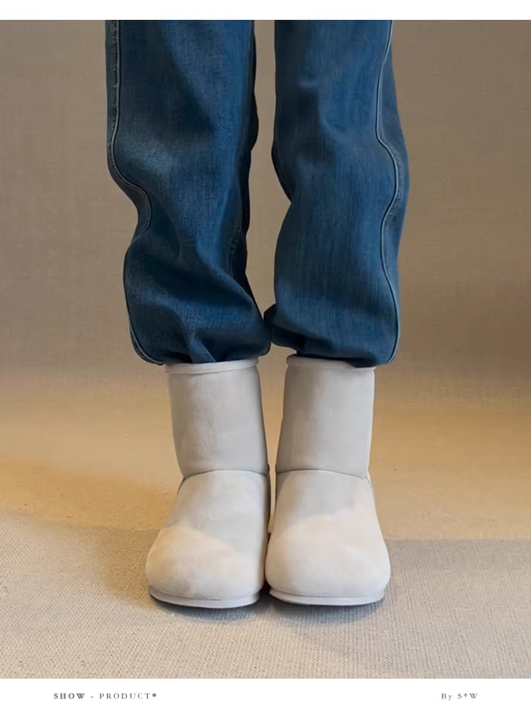 Phiên bản da bò ~ Giày bốt đi tuyết cổ điển bằng da thật mũi rộng dễ thương và độc đáo dành cho nữ, kiểu lười, đế bằng, lót lông cừu và bông dày.