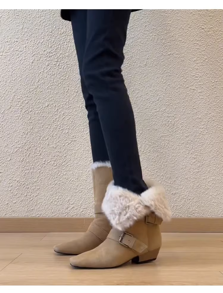 Phiên bản da bò ~ Giày bốt đi tuyết dày có khóa thắt lưng mũi vuông thời trang dành cho nữ, có thể mang hai chiều, gót dày, giày bốt cotton mùa đông sành điệu