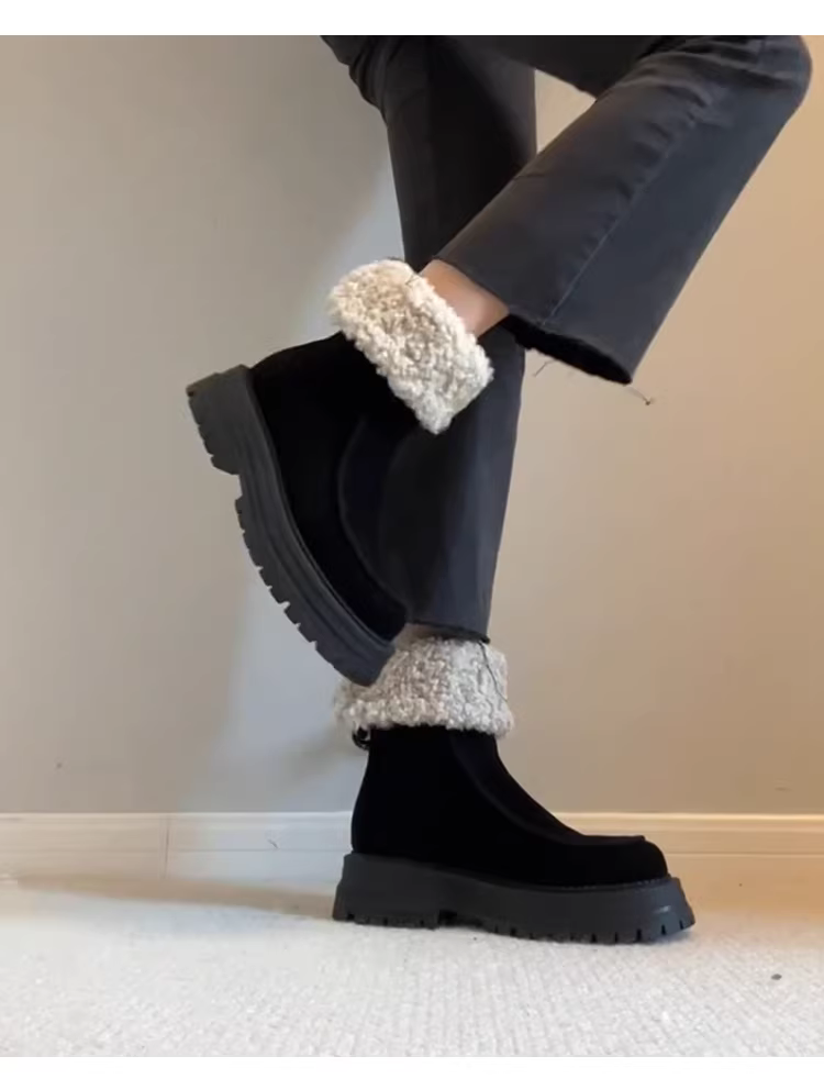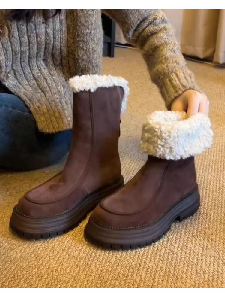 - Phiên bản da bò ~ Giày bốt đi tuyết đế dày bằng da lộn dành cho nữ, len cừu cổ điển, khóa kéo phía sau, lót lông cừu, bốt cotton cỡ lớn ấm áp ở vùng Đông Bắc