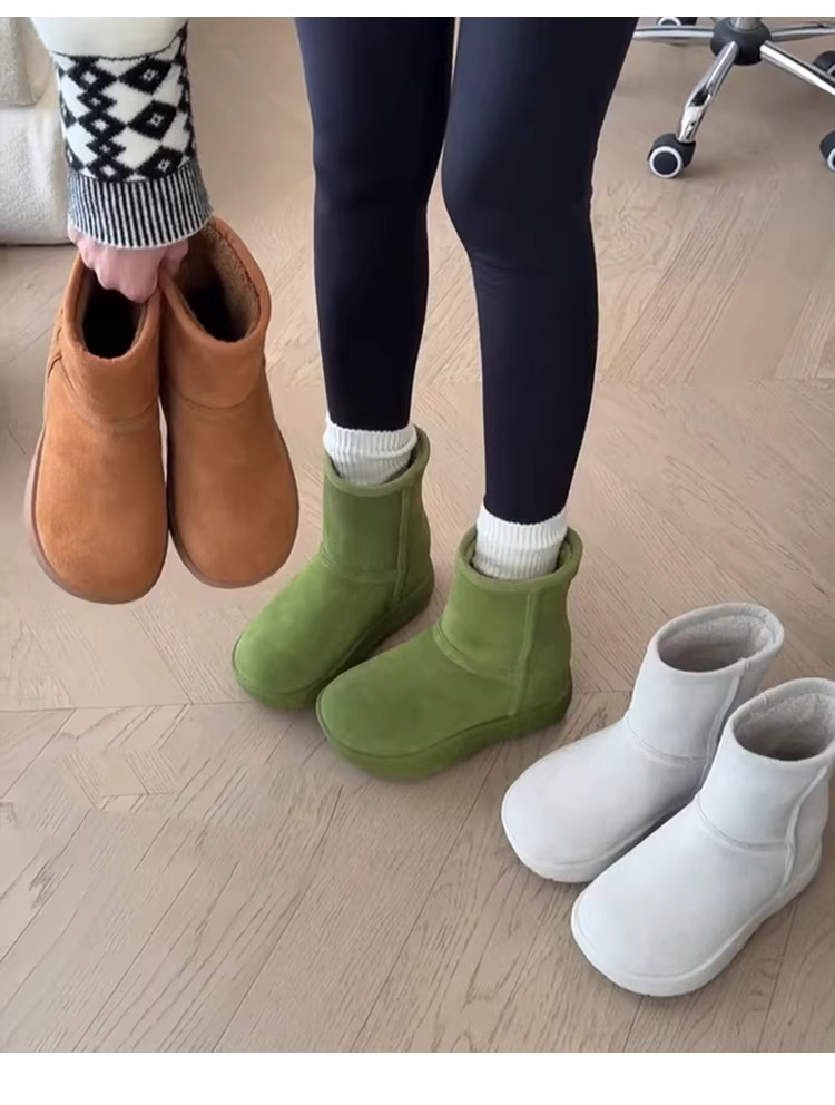 Phiên bản da bò ~ Giày bốt đi tuyết đế dày tăng chiều cao bên trong màu xanh lá cây cổ điển, độc đáo, dễ thương dành cho nữ, da lộn có lớp lót lông cừu, bốt cotton mùa đông.