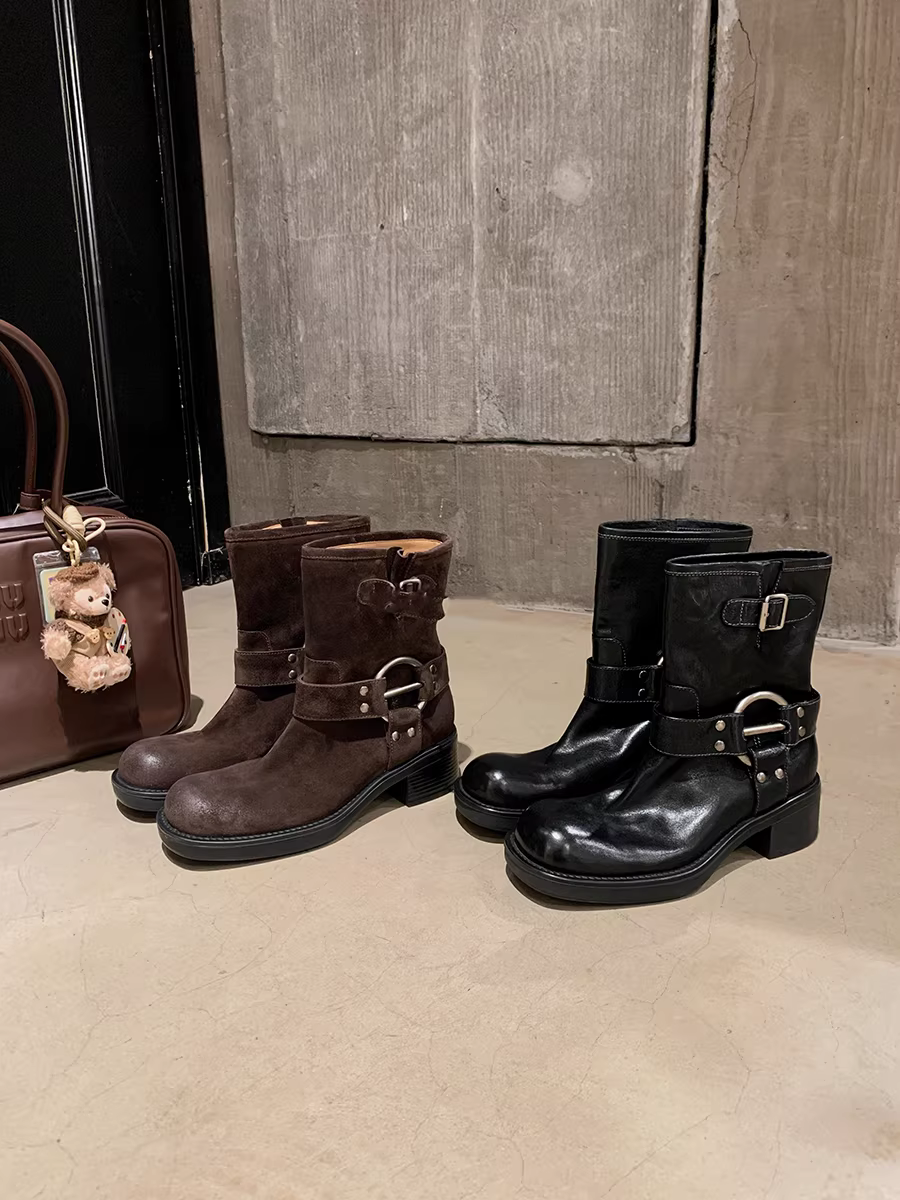Phiên bản da bò~ Giày bốt đi xe máy cổ điển kiểu Anh có mũi vuông có khóa kim loại, giày bốt kiểu phương Tây mũi tròn đa năng, giày bốt ngắn gót dày giúp thon gọn dành cho nữ