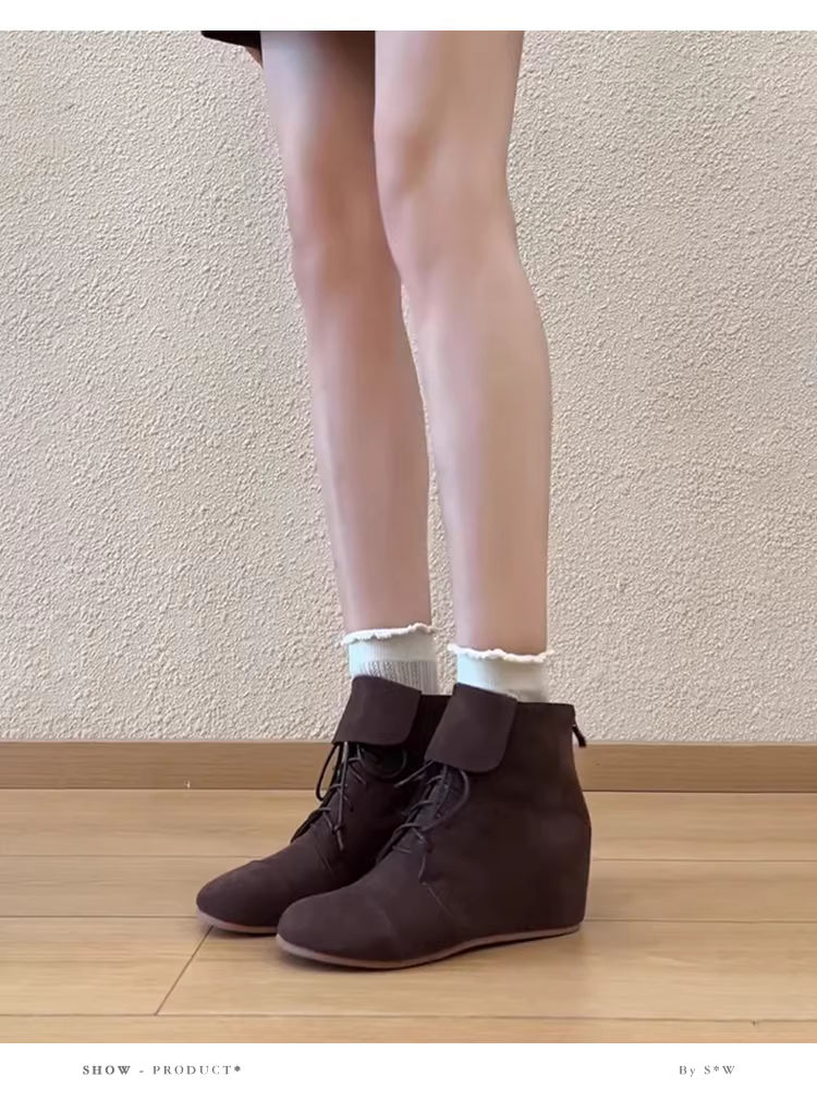Phiên bản da bò ~ Giày bốt Martin da lộn dành cho nữ, phong cách cổ điển với khóa kéo phía sau có thể gấp lại, buộc dây, giày bốt ngắn tăng chiều cao dành cho phụ nữ nhỏ nhắn, hợp thời trang.