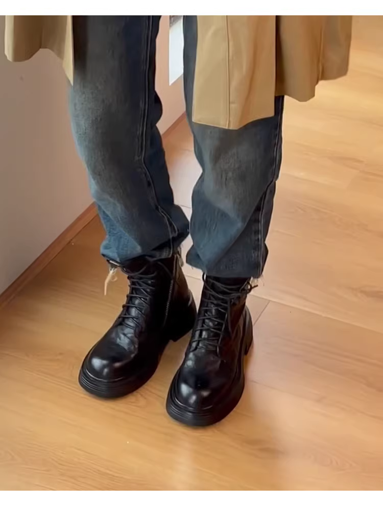 Phiên bản da bò ~ Giày bốt Martin đế dày đế dày kiểu cổ điển dành cho nữ, giày bốt cổ ngắn kiểu Anh có dây buộc bằng da thật có khóa kéo bên hông kiểu Anh