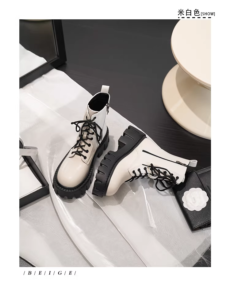 Phiên bản da bò~ Giày bốt Martin kiểu Anh dành cho nữ 2025, da thật, đế platform dày, tăng chiều cao, buộc dây, kiểu ngắn dành cho người nhỏ nhắn
